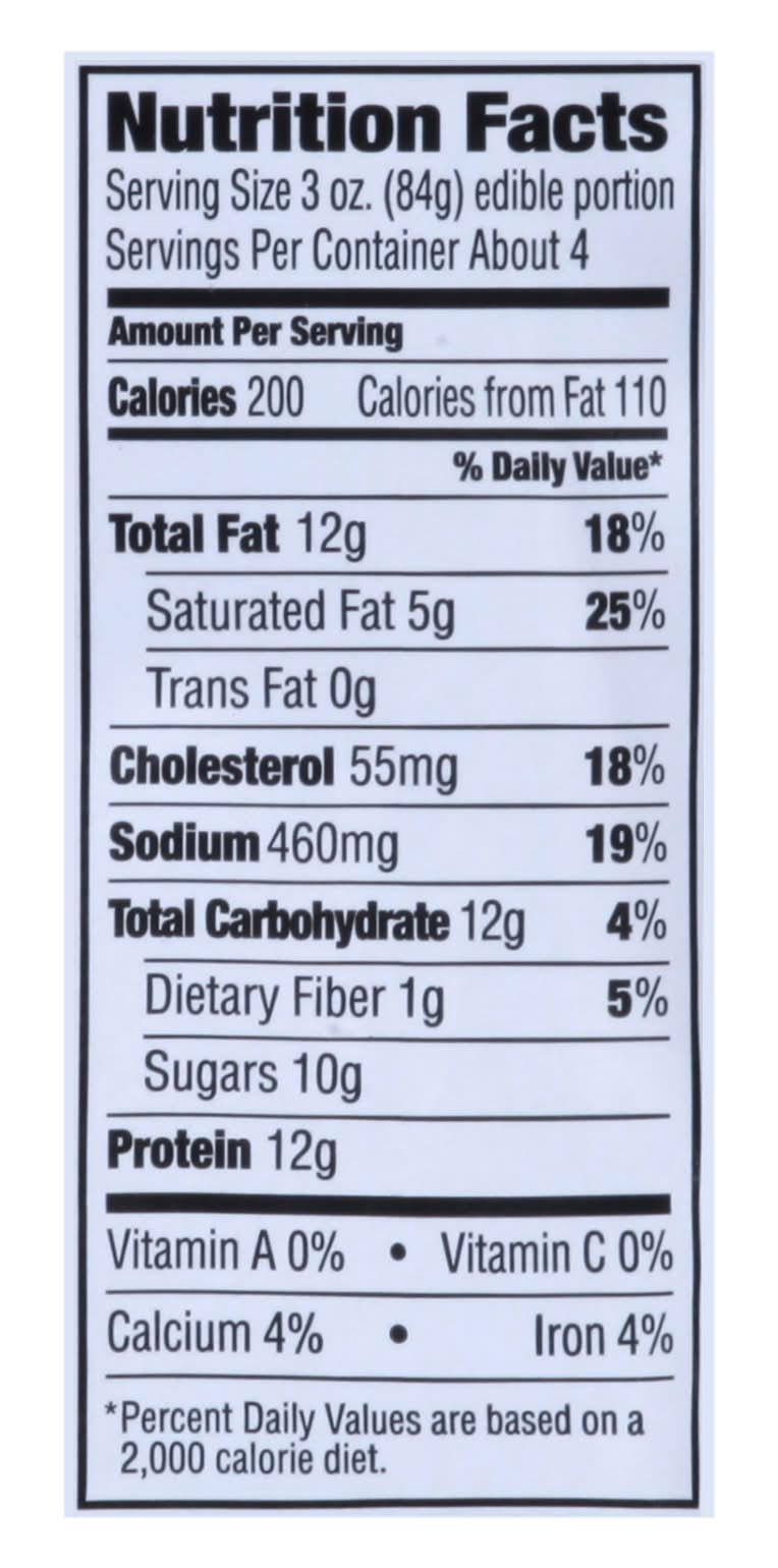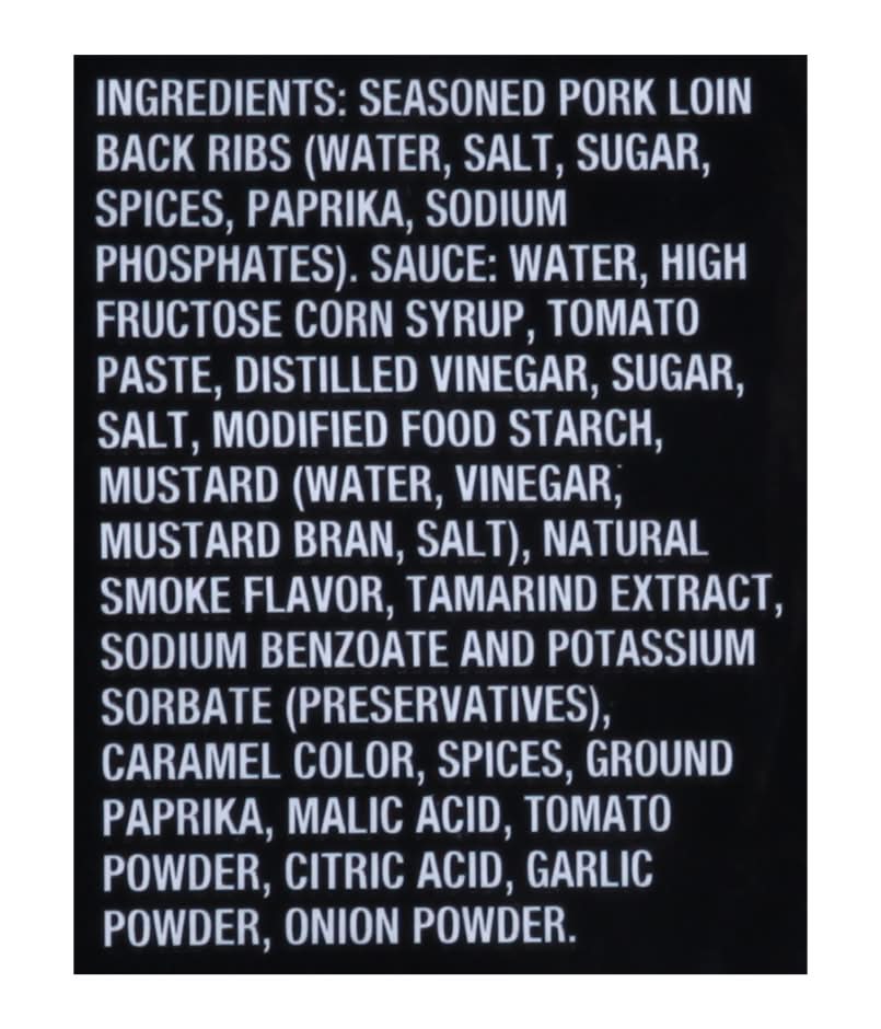 Ingredients: Seasoned Pork Loin Back Ribs (Water, Salt, Sugar, Spices, Paprika, Sodium Phosphates). Sauce: Water, High Fructose Corn Syrup, Tomato Paste, Distilled Vinegar, Sugar, Salt, Modified Food Starch, Mustard (Water, Vinegar, Mustard Bran, Salt), Natural Smoke Flavor, Tamarind Extract, Sodium Benzoate and Potassium Sorbate (Preservatives), Caramel Color, Spices, Ground Paprika, Malic Acid, Tomato Powder, Citric Acid, Garlic Powder, Onion Powder Contains: Mustard, Corn