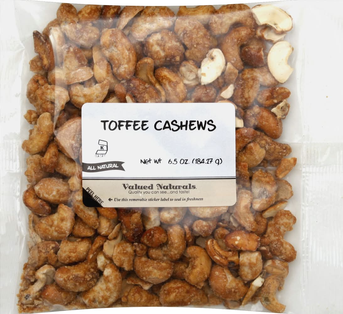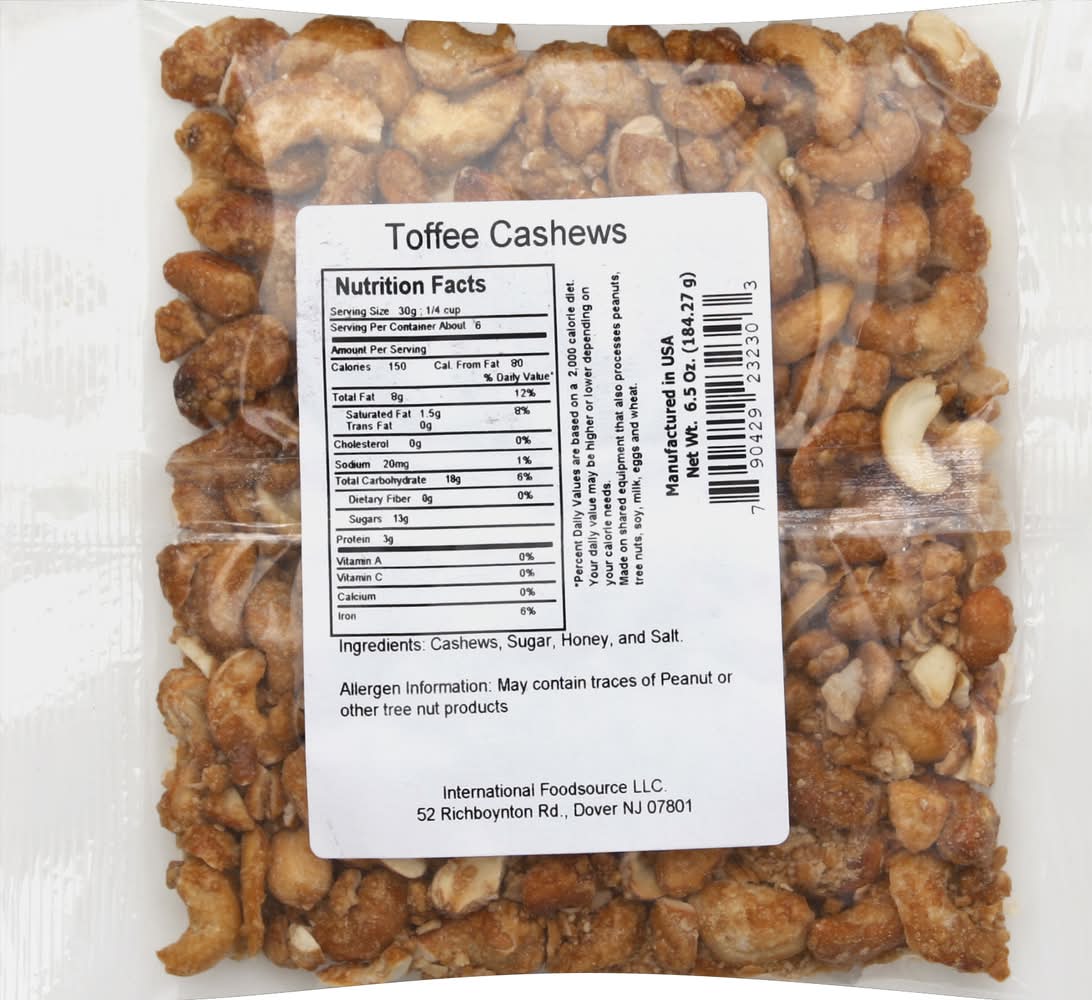 Ingredients: Cashews, Sugar, Honey, and Salt. Contains: Milk, Eggs, Peanuts, Tree Nuts, Soybeans, Wheat