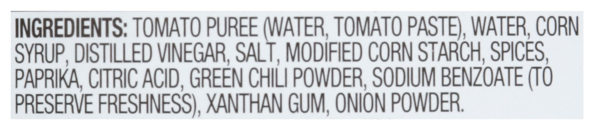 Ingredients: Tomato Puree (Water, Tomato Paste), Water, Corn Syrup, Distilled Vinegar, Salt, Modified Corn Starch, Spices, Paprika, Citric Acid, Green Chili Powder, Sodium Benzoate (to Preserve Freshness), Xanthan Gum, Onion Powder Contains: Corn