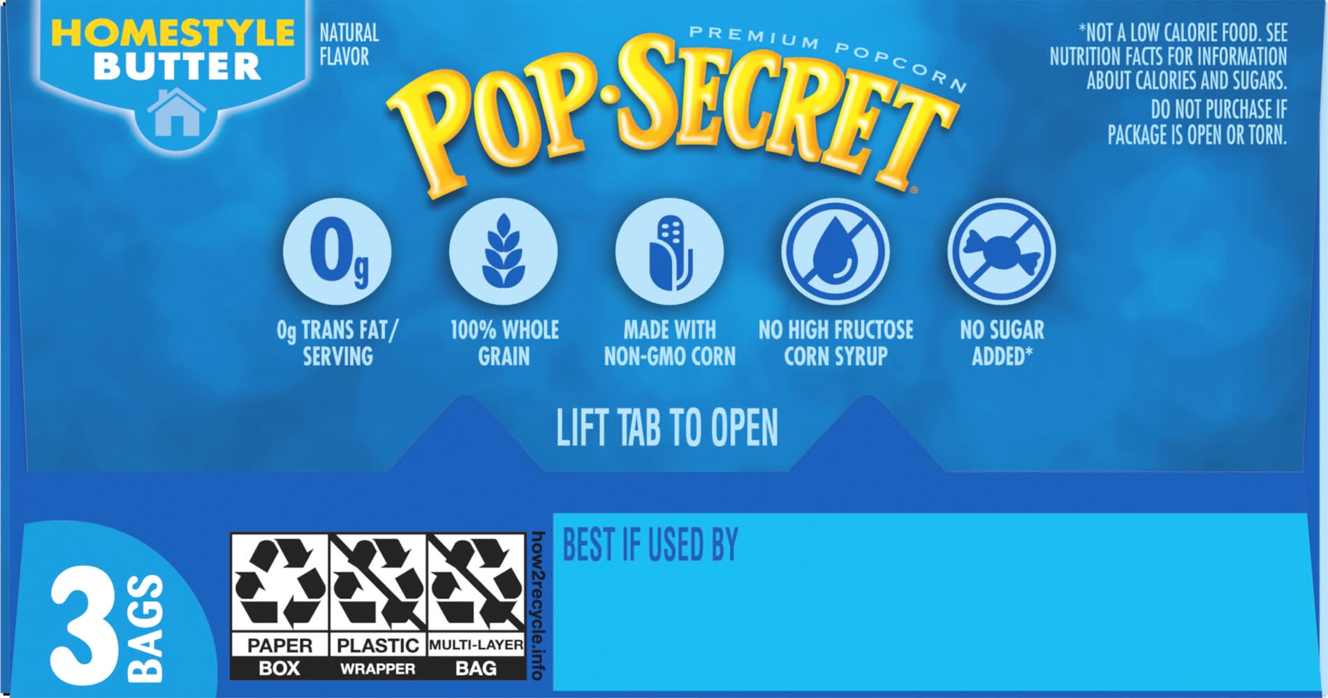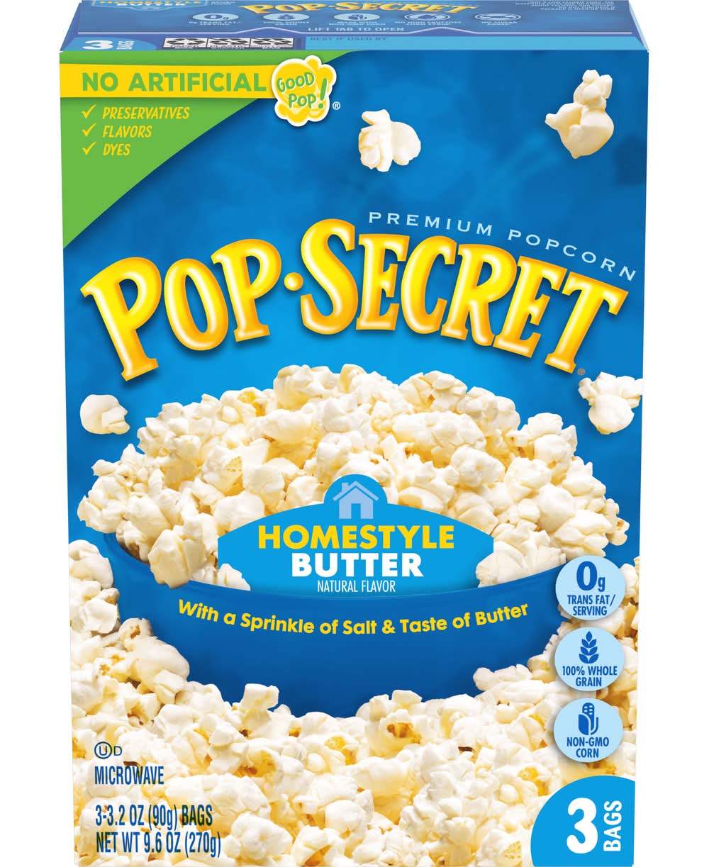 We're going back to our roots This Pop Secret recipe delivers a taste of home with its sprinkle of buttery flavor and kernels that pop up light and fluffy. Start popping and get ready for people to follow the amazing aroma. Our homestyle microwaveable popcorn bags pop up fast, hot, and delicious. They’re perfect for movie night, TV time or any time you’re craving a buttery tasting snack. And with more than 3 servings in each of our popcorn bags, Pop Secret Homestyle Butter Flavor Popcorn is perfect for sharing. Plus, since they’re made with non GMO kernels and no artificial preservatives or flavors, you can feel good about enjoying this microwave popcorn snack. So, go ahead, start popping and enjoying a handful or two of snack-time fun! Since 1985, Pop Secret has been serving up warm, buttery tasting craveable popcorn snacks that bring everyone together. It’s the secret that’s too good to keep to yourself • Flavor: Homestyle butter • Pack size: 3 • Snyder's-lance, Inc, Charlotte,NC,28277-2706,USA • Packaging: Reusable