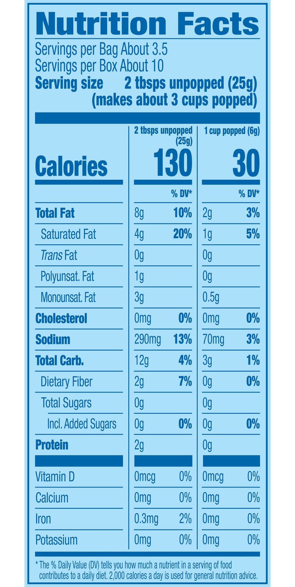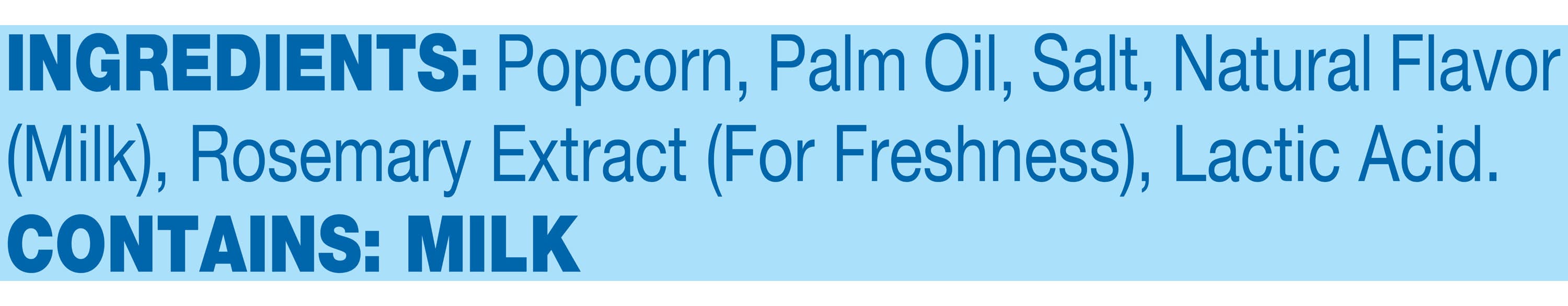 Ingredients: Popcorn, Palm Oil, Salt, Natural Flavor (Milk), Rosemary Extract (for Freshness), Lactic Acid Contains: Milk, Corn
