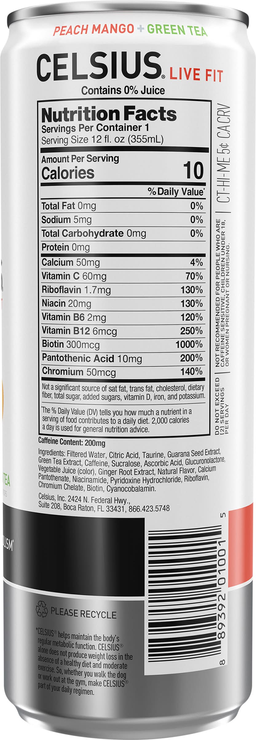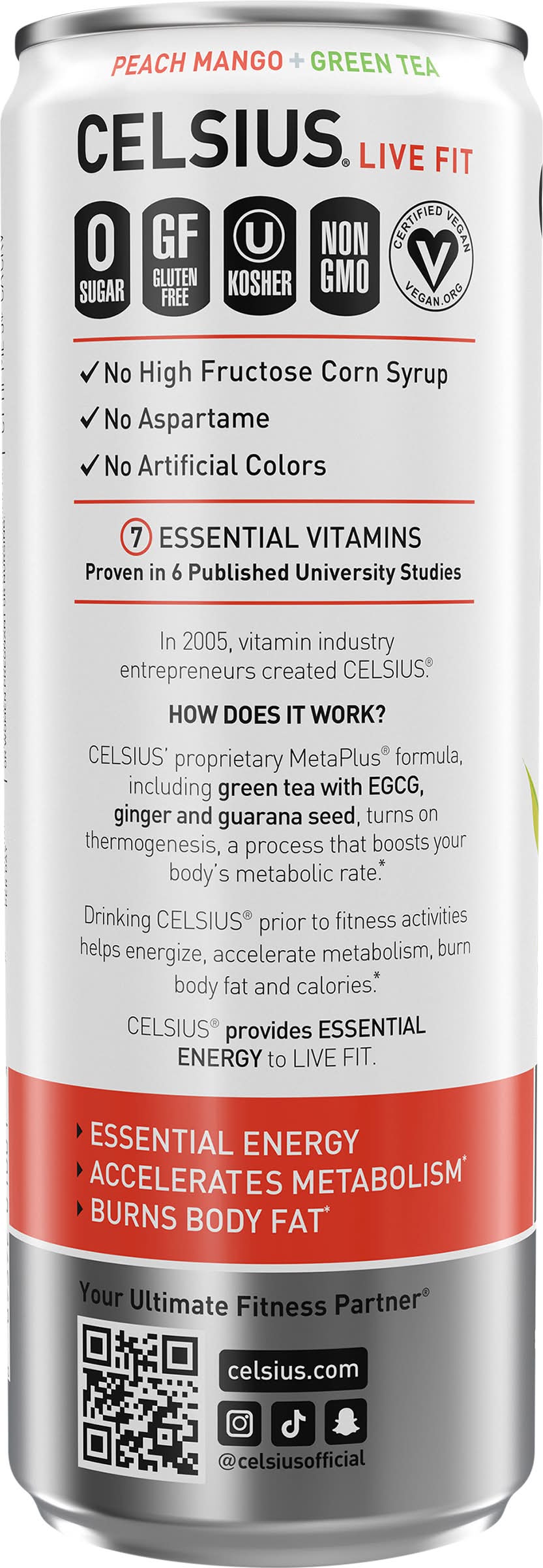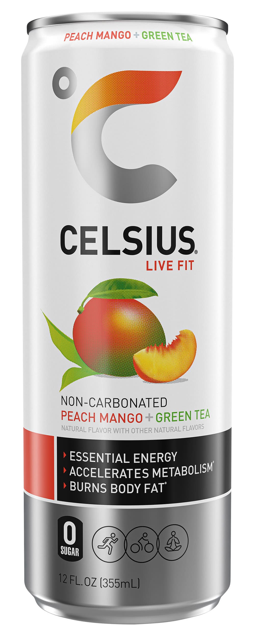 It is functional, essential energy, a better for you, premium alternative to traditional energy drinks. As a global, lifestyle fitness drink,it was created to help people live fit, exceed their goals and elevate their everyday lives. Made with proven, premium ingredients, 7 essential vitamins and no artificial colors, no aspartame, no high fructose corn syrup. Our proprietary metaplus blend contains green tea extract with egcg. It also includes guarana seed extract, ginger root for flavor and digestion, vitamin c to help support your immune system, vitamin b for energy production, and chromium to help control hunger, making it an ideal pre workout drink. This green tea combines the tropical sweetness of mangos and juicy, vibrant peaches without all the bubbles. Reminiscent of a brisk, refreshing peach iced tea. Made with clinically proven ingredients, this non carbonated flavor of this has the perfect balance of flavor and energy that serves as an awesome pick me up for active lifestyles. Make it your go to choice for essential energy. • Flavor: Peach mango + green tea • Celsius Inc., 2424 N. Federal Hwy,Ste 208,Boca Raton,FL,33431 • Packaging: Reusable