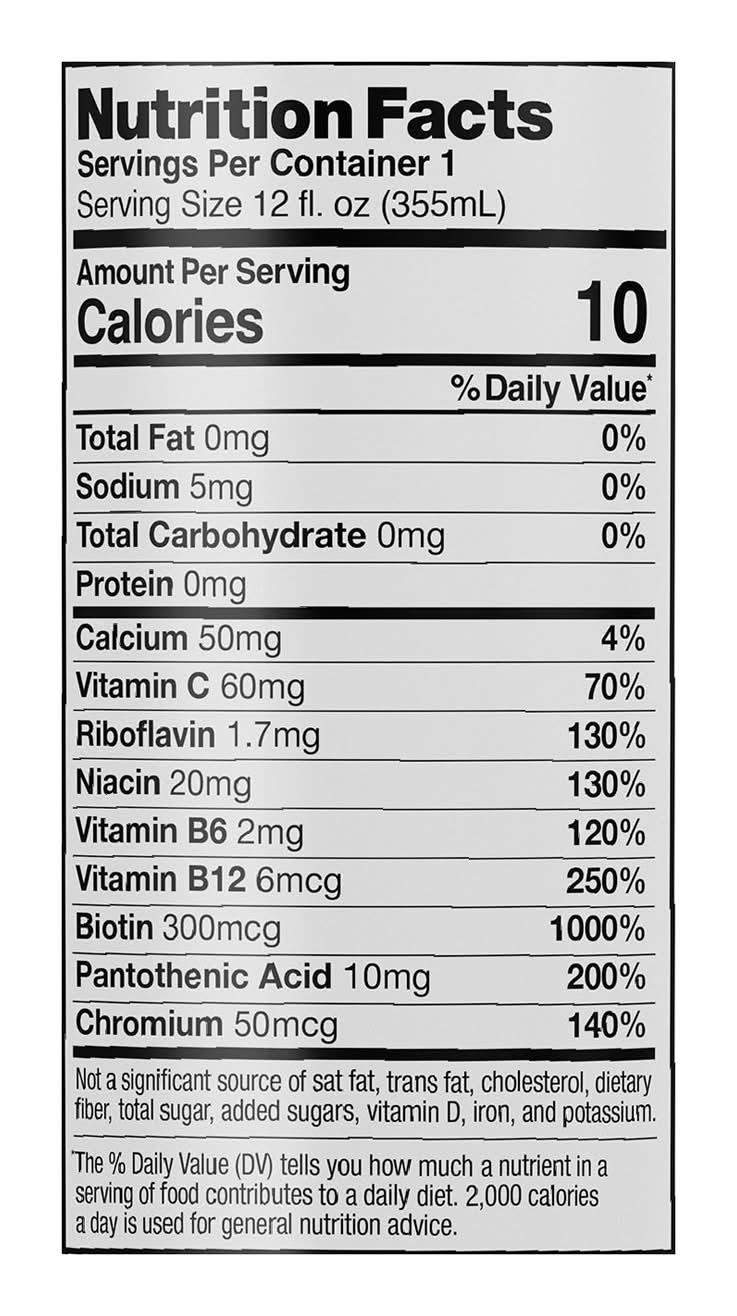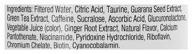 Ingredients: MetaPlus Proprietary Blend: Taurine, Guarana Extract Seed, Caffeine as Caffeine Anhydrous, Glucuronolactone, Ginger Extract Root, Green Tea Leaf Extract Standardized to 15% EGCG. Other Ingredients: Carbonated Filtered Water, Citric Acid, Sucralose, Vegetable Juice for Color Sucralose, Natural Flavor. Contains 200mg of caffeine