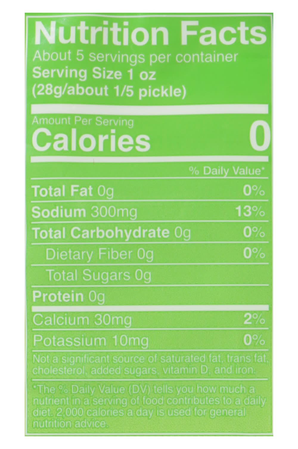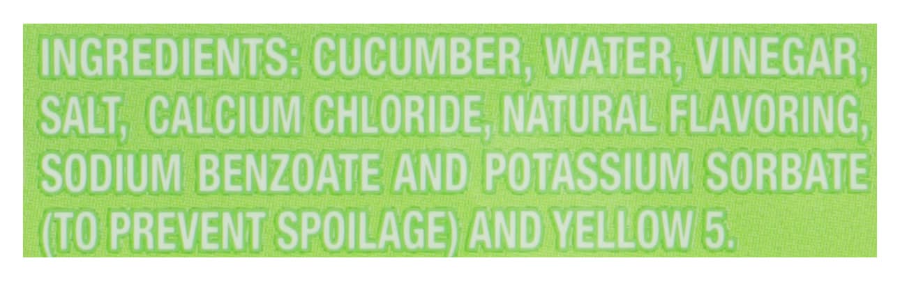 Ingredients: Cucumber, Water, Vinegar, Salt, Calcium Chloride, Natural Flavoring, Sodium Benzoate and Potassium Sorbate (to Prevent Spoilage) and Yellow 5