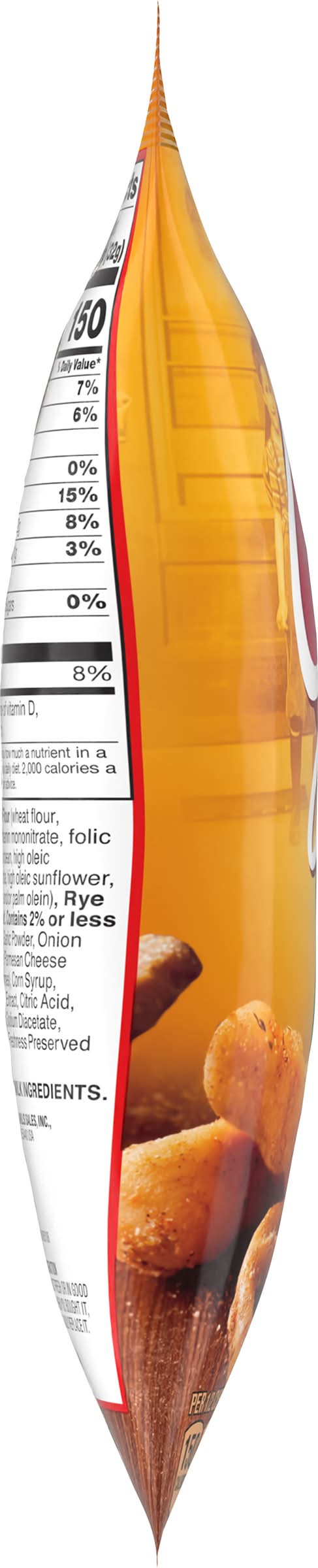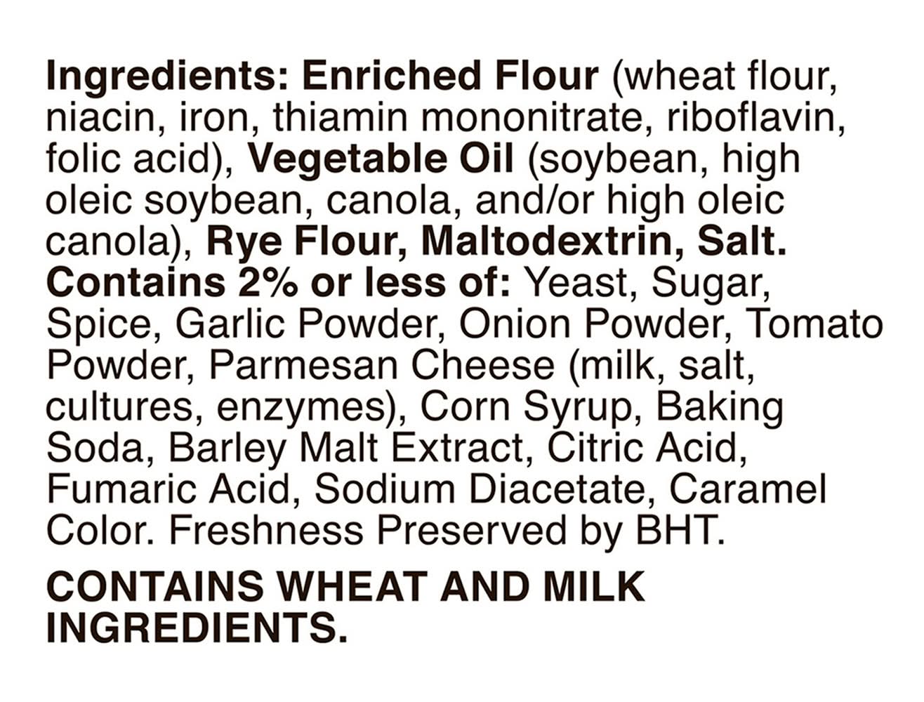 Ingredients: Enriched Flour (Wheat Flour, Niacin, Iron, Riboflavin, Thiamin Mononitrate, Folic Acid), Vegetable Oil (Soybean, High Oleic Soybean, High Oleic Canola, High Oleic Sunflower, Palm, Fractionated Palm and/or Palm Olein), Rye Flour, Maltodextrin, Salt, Contains 2% or Less of: Yeast, Sugar, Spice, Garlic Powder, Onion Powder, Tomato Powder, Parmesan Cheese (Milk, Salt, Cultures, Enzymes), Corn Syrup, Baking Soda, Barley Malt Extract, Citric Acid, Rye Flour, Fumaric Acid, Sodium Diacetate, Caraway, Caramel Color. Freshness Preserved by BHT Contains: Wheat, Milk, Soybeans, Corn, Barley