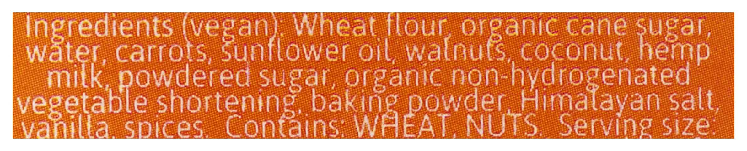 Ingredients: Vegan: Wheat Flour, Organic Cane Sugar, Water, Carrots, Sunflower Oil, Walnuts, Coconut, Hemp Milk, Powdered Sugar, Organic Non-Hydrogenated Vegetable Shortening, Baking Powder, Himalayan Salt, Vanilla, Spices Contains: Wheat, Tree Nuts