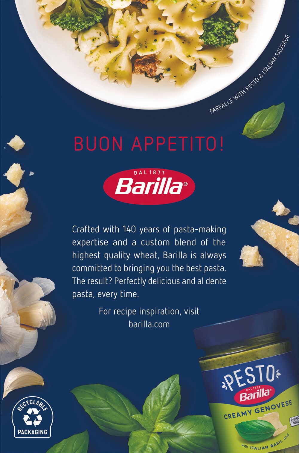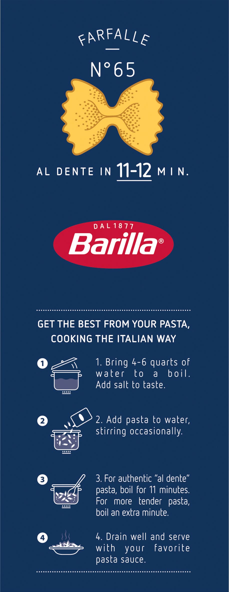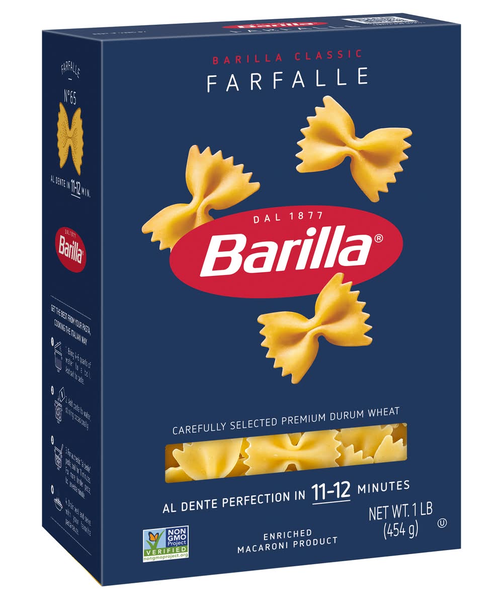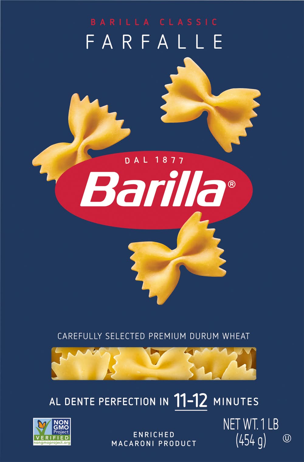 Farfalle, also called "bowtie pasta," consists of rectangular or oval pieces of pasta that are pinched in the middle. Barilla Farfalle pasta is made with non-GMO ingredients. Barilla is a family-owned Italian company making pasta since 1877. Barilla brings you the best pasta made with care and the highest quality ingredients; Barilla works to bring you the best pasta that cooks perfectly al dente every time. Our farfalle pasta is made from the finest durum wheat and is non-GMO project verified and Kosher Certified. Perfect for pairing with your favorite pasta sauce. Get inspired with Barilla! Enjoy the full range of Barilla pasta and pasta sauces, including Ready Pasta, Protein+ Pasta, Whole Grain Pasta, Gluten Free Pasta, Chickpea Pasta and Red Lentil Pasta. • Size: 16.00 OZ • Barilla America, Northbrook, IL, 60062 • Packaging: Reusable