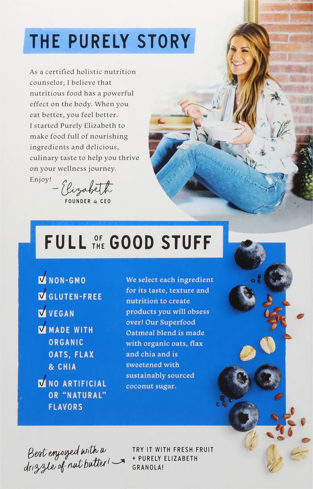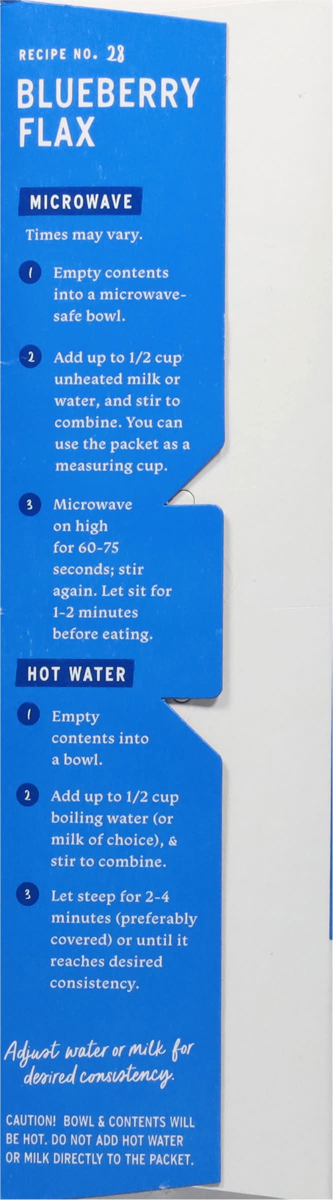 Microwave: times may vary. 1. empty contents into a microwave- safe bowl. 2. add up to 1/2 cup unheated milk or water, and stir to combine. you can use the packet as a measuring cup. 3. microwave on high for 60-75 seconds; stir again. let sit for 1-2 minutes before eating. hot water: 1. empty contents into a bowl. 2. add up to 1/2 cup boiling water (or milk of choice), & stir to combine. 3. let steep for 2-4 minutes (preferably covered) or until it reaches desired consistency. adjust water or milk for desired consistency. caution! bowl & contents will be hot. do not add hot water or milk directly to the packet. try it with fresh fruit + purely elizabeth granola!