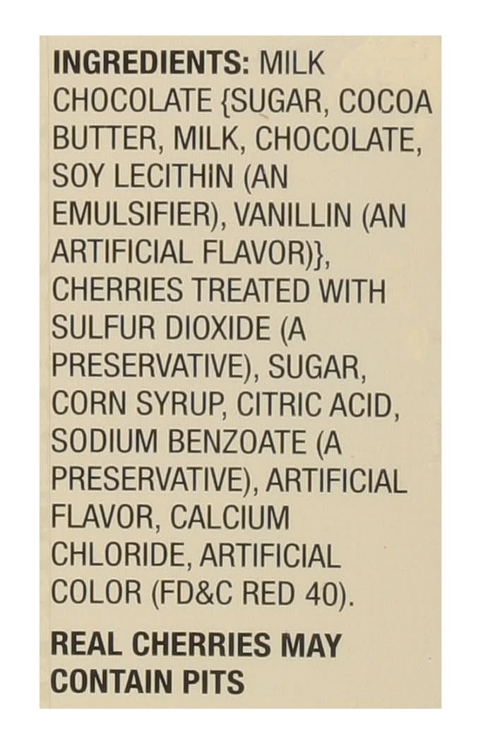 Ingredients: Milk Chocolate {Sugar, Cocoa Butter, Milk, Chocolate, Soy Lecithin (an Emulsifier), Vanillin (an Artificial Flavor)}, Cherries Treated with Sulfur Dioxide (a Preservative), Sugar, Corn Syrup, Citric Acid, Sodium Benzoate (a Preservative), Artificial Flavor, Calcium Chloride, Artificial Color (FD&C Red 40) Contains: Soybeans, Milk