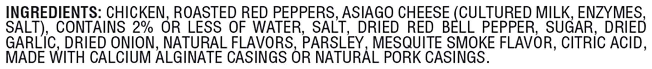 Ingredients: Chicken, Roasted Red Peppers, Asiago Cheese (Cultured Milk, Enzymes, Salt), Contains 2% or Less of Water, Salt, Dried Red Bell Pepper, Sugar, Dried Garlic, Dried Onion, Natural Flavors, Parsley, Mesquite Smoke Flavor, Citric Acid, Made with Calcium Alginate Casings or Natural Pork Casings Contains: Milk