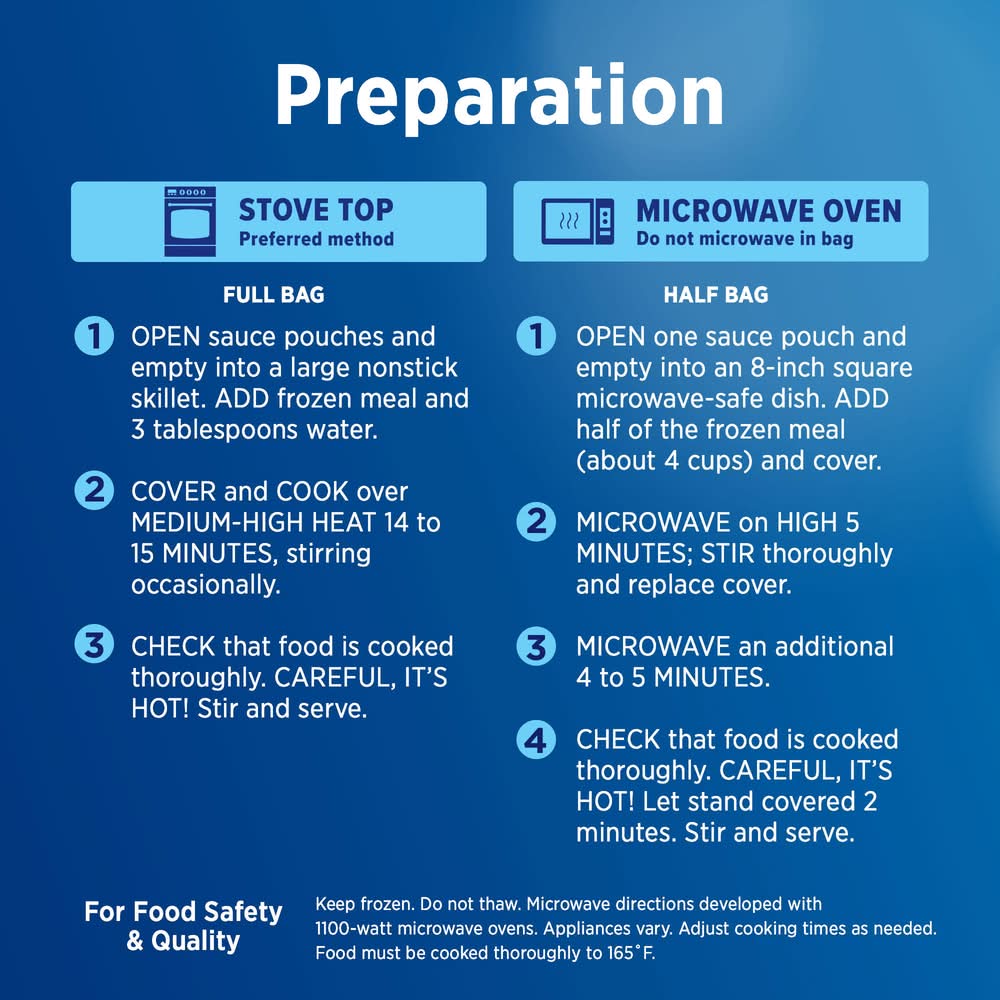 Directions for use: Cook thoroughly. For food safety and quality. Keep frozen. Do not thaw. Microwave directions developed with 1100-watt microwave ovens. Appliances vary. Adjust cooking times as needed. Food must be cooked thoroughly to 165 degrees F. Stove tops full bag preferred method. Open sauce pouches and empty into a large nonstick skillet. Add frozen meal and 3 tablespoons water. Cover and cook over medium-high heat 14 to 15 minutes, stirring occasionally. Check that food is cooked thoroughly. Careful, ifs hot! Stir and serve. Microwave oven - half bag Do not microwave in bag. (1) Open one sauce pouch and empty into an 8-inch square microwave sate dish. Add hall of the frozen meal (about 4 cups) and cover. (2) Microwave on high 5 minutes; Stir thoroughly and replace cover. (3) Microwave an additional 4 to 5 minutes. (4) Check that food is cooked thoroughly. Careful, it's hot! Let stand covered 2 minutes. Stir and serve. Keep frozen. Storage recommendation: Keep frozen.