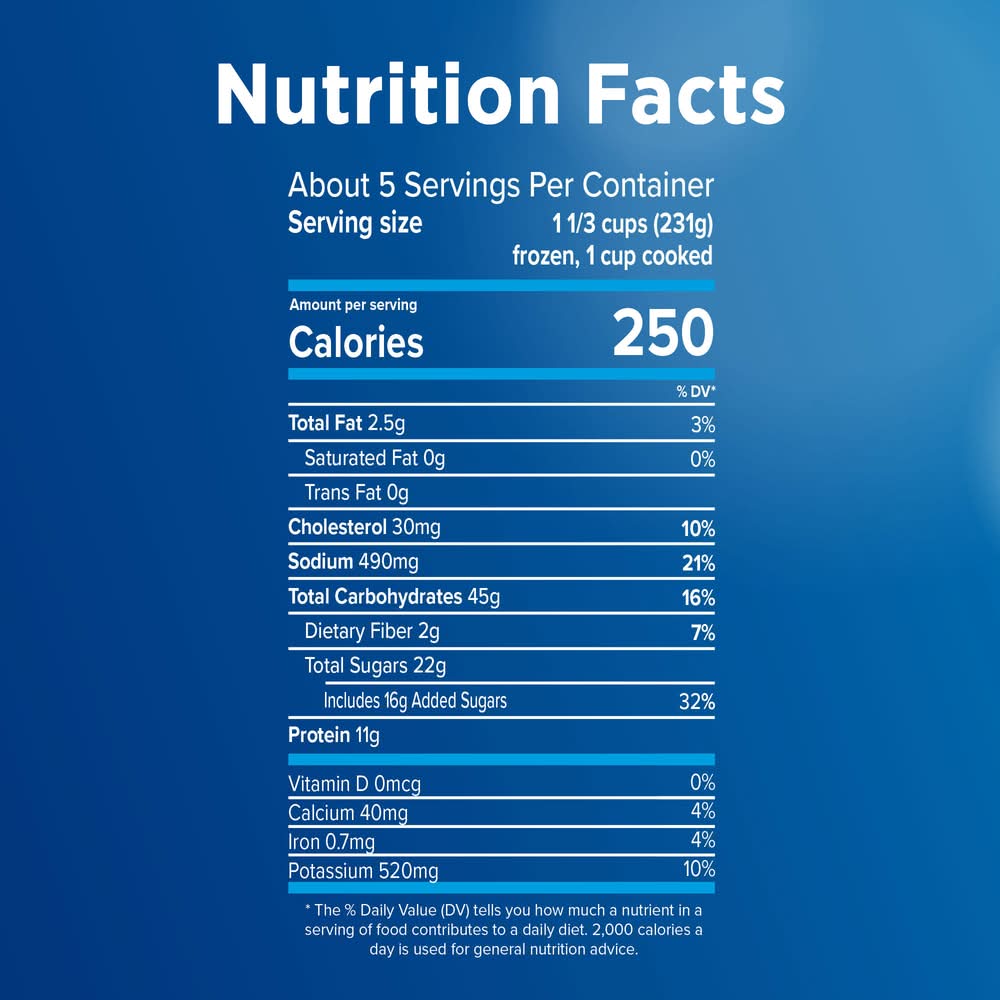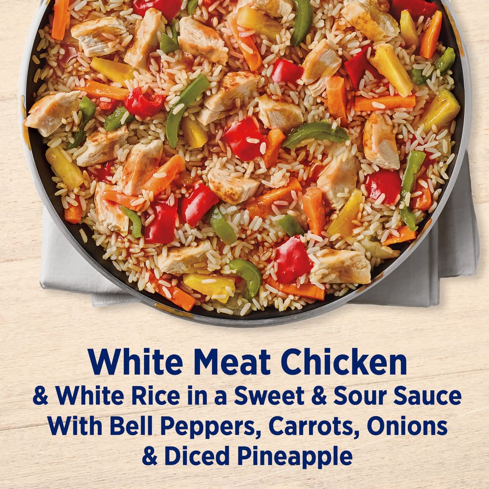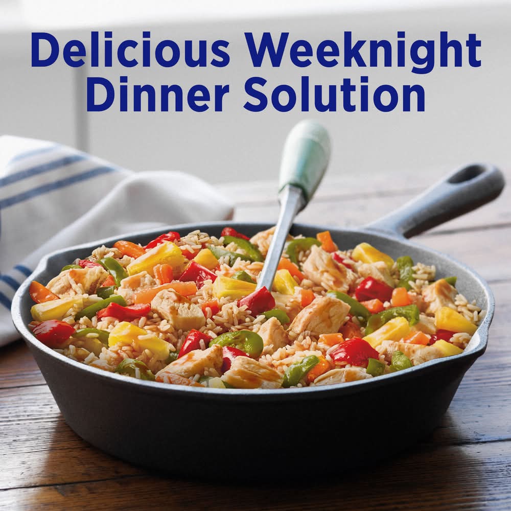 Serve up a delicious meal easily with Birds Eye Voila! Sweet & Sour Chicken. With premium Birds Eye vegetables, quality meat and chef-inspired sauces in every bag, Birds Eye Voila! offers complete frozen meals for quick weeknight dinners the whole family will love. This delicious sweet and sour chicken frozen dinner combines white meat chicken and rice with julienne carrots, red and green bell peppers, diced pineapple and onion strips in a delicious sweet and sour sauce for a flavorful meal you can make any night of the week. This Birds Eye chicken dinner with frozen stir fry vegetables and frozen rice is made with no preservatives and no artificial flavors for a quick and convenient family dinner solution without compromise. Easily prepare frozen family meals in about 20 minutes on the stove-top or in the microwave. For stove-top preparation, pour sauce pouch and contents of the bag into a skillet with water, stir and simmer until heated through according to package instructions. For even faster preparation, microwave the sweet and sour chicken rice frozen meal according to the package instructions. Store this 42 ounce bag in the freezer to maintain freshness until you are ready to prepare frozen family dinners. It’s good to eat vegetables, so Birds Eye makes vegetables good to eat. • Conagra Brands, PO Box 3534, Chicago, IL, 60654 • Packaging: Reusable