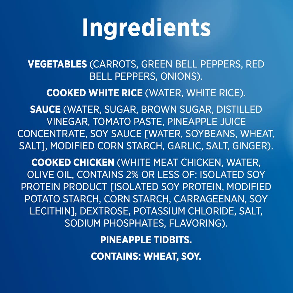 Ingredients: INGREDIENTS: VEGETABLES (CARROTS, GREEN BELL PEPPERS, RED BELL PEPPERS, ONIONS), COOKED RICE (WATER, RICE), SAUCE (WATER, SUGAR, BROWN SUGAR, DISTILLED VINEGAR, TOMATO PASTE, PINEAPPLE JUICE CONCENTRATE, SOY SAUCE [WATER, SOYBEANS, WHEAT, SALT], MODIFIED FOOD STARCH, GARLIC, SALT, SPICE), COOKED CHICKEN (WHITE MEAT CHICKEN, WATER, OLIVE OIL, CONTAINS 2% OR LESS OF ISOLATED SOY PROTEIN PRODUCT [ISOLATED SOY PROTEIN, MODIFIED POTATO STARCH, CORN STARCH, CARRAGEENAN, SOY LECITHIN], DEXTROSE, POTASSIUM CHLORIDE, SALT, SODIUM PHOSPHATES, FLAVORING), PINEAPPLE TIDBITS. Contains: Soy, Wheat