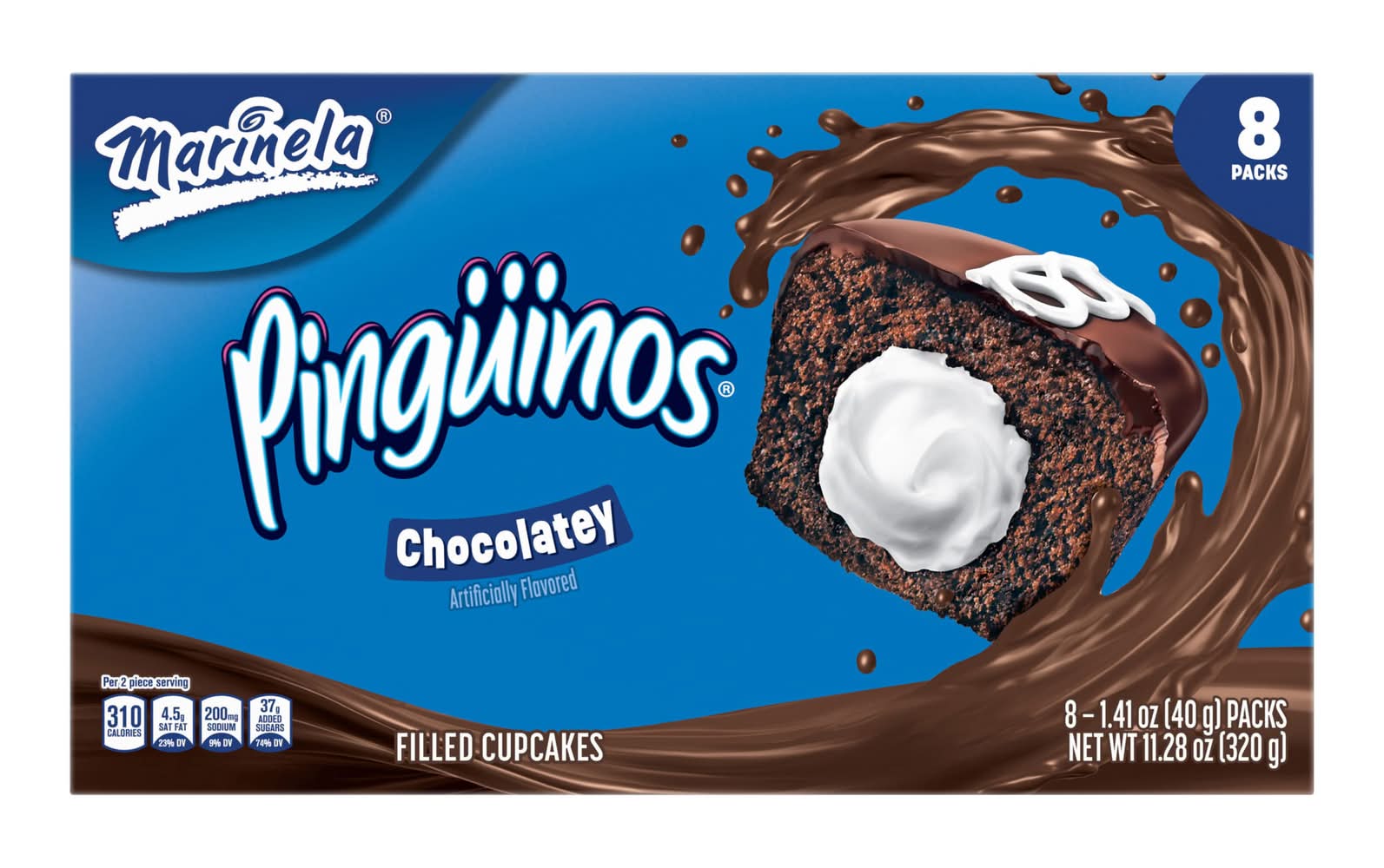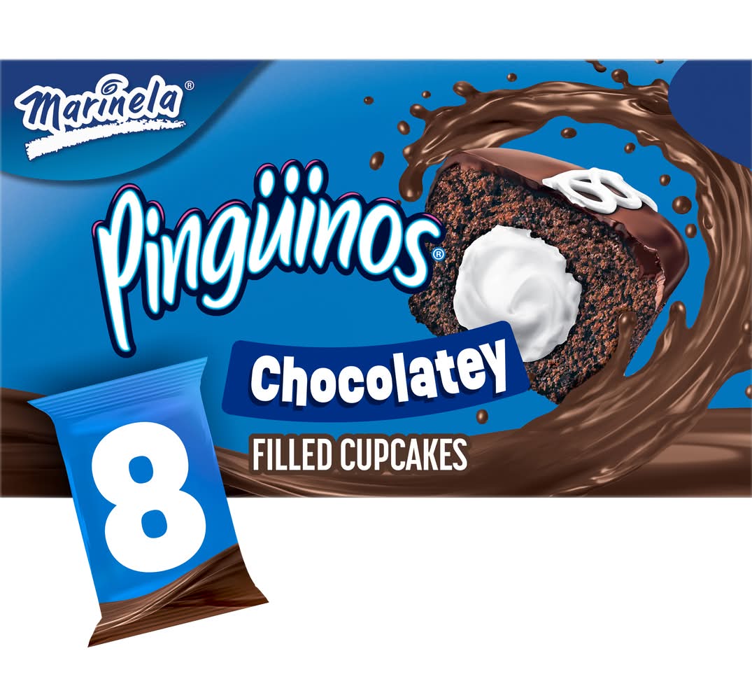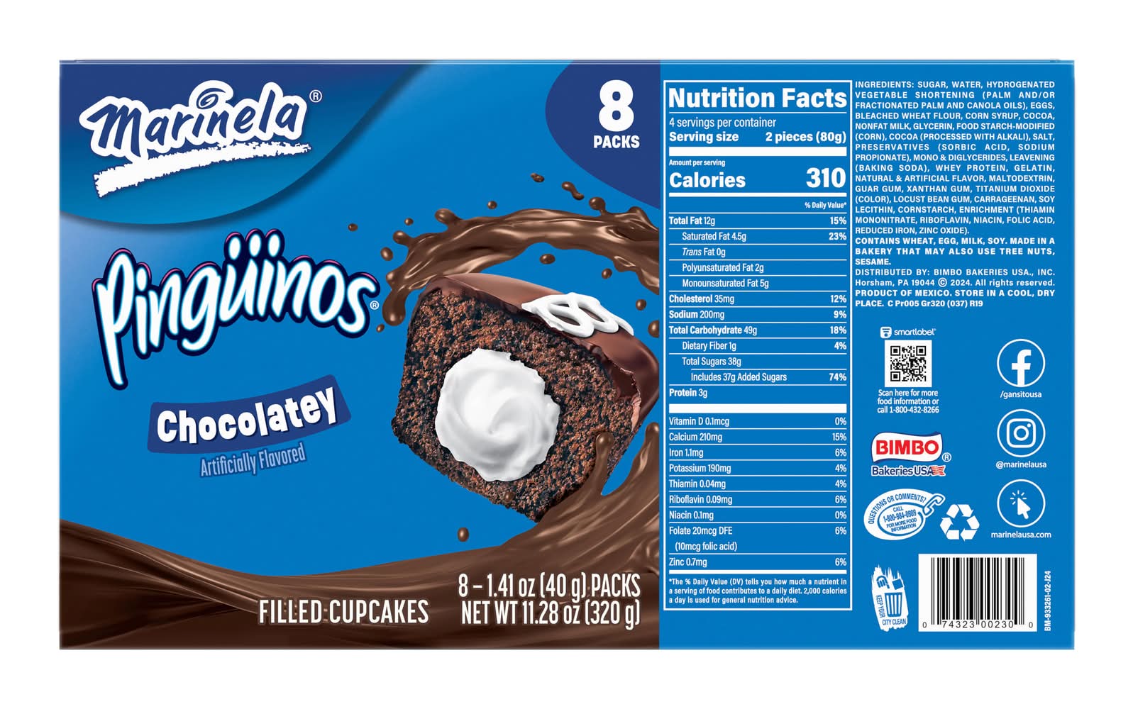Indulge in the delightful taste of Marinela Pingüinos Chocolate Crème Filled Cupcakes, 8 packs, 11.28 oz, a product of Mexico that brings a new look with the same great taste you love. Marinela Filled Cupcakes are soft chocolate snack cakes lovingly filled with rich crème, making them an irresistible treat for any occasion, especially as a sweet addition to birthday celebrations or cozy coffee breaks. Marinela Pingüinos Chocolate Crème Filled Cupcakes, 8 packs, 11.28 oz, perfectly pair with your favorite beverages, whether you're enjoying a slice of coffee crumb cake or savoring a snowball snack. With their creamy filling and chocolatey exterior, Marinela Pingüinos Chocolate Crème Filled Cupcakes, 8 packs, 11.28 oz, stand out among other treats like gansito cake or banana snack cake, ensuring they are a hit with both kids and adults alike. Elevate your dessert experience with Marinela Pingüinos Chocolate Crème Filled Cupcakes, 8 packs, 11.28 oz, perfect for sharing or satisfying your cravings anytime. Bimbo Bakeries Usa, Inc., Horsham,PA,19044