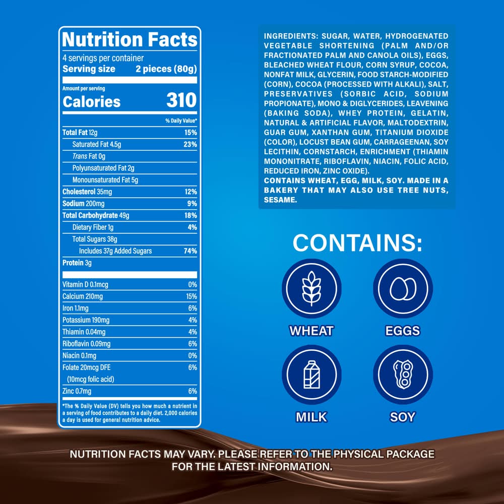 Ingredients: SUGAR, WATER, HYDROGENATED VEGETABLE SHORTENING [PALM AND/OR FRACTIONATED PALM OIL AND, CANOLA OILS], EGGS, BLEACHED WHEAT FLOUR, CORN SYRUP, COCOA, NONFAT MILK, GLYCERIN, FOOD STARCH-MODIFIED (CORN), COCOA (PROCESSED WITH ALKALI), SALT, PRESERVATIVES [SORBIC ACID, SODIUM PROPIONATE], MONO DIGLYCERIDES, LEAVENING [BAKING SODA], WHEY PROTEIN, GELATIN, NATURAL ARTIFICIAL FLAVOR, MALTODEXTRIN, GUAR GUM, XANTHAN GUM, TITANIUM DIOXIDE (COLOR), LOCUST BEAN GUM, CARRAGEENAN, SOY LECITHIN, CORNSTARCH, ENRICHMENT [THIAMIN MONONITRATE, RIBOFLAVIN, NIACIN, FOLIC ACID, REDUCED IRON, ZINC OXIDE], . Contains: CONTAINS EGG, MILK, SOY, WHEAT.