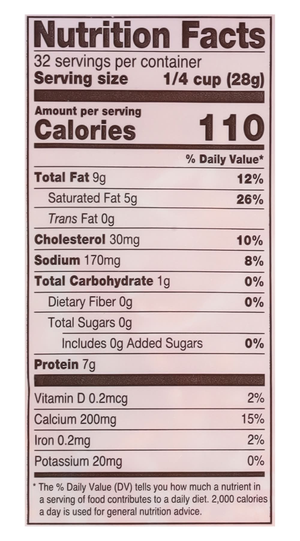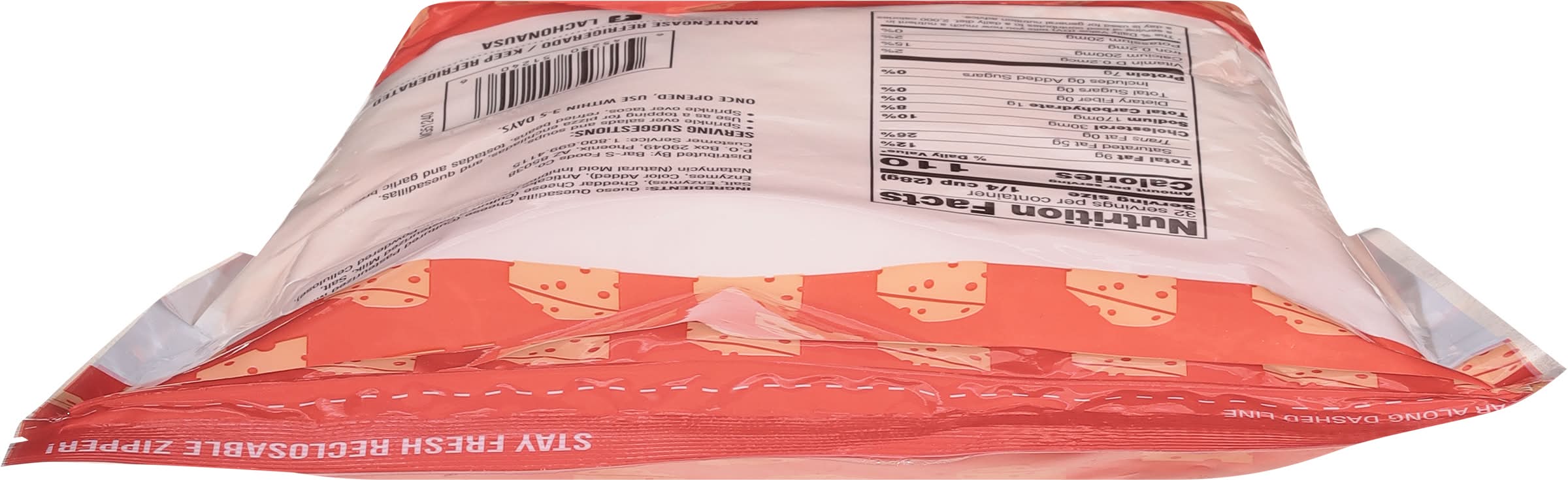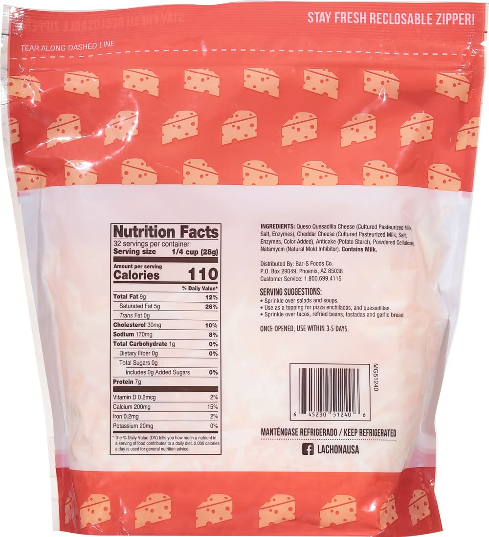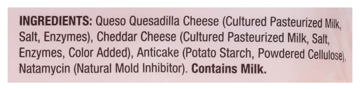 Ingredients: Queso Quesadilla Cheese (Cultured Pasteurized Milk, Salt, Enzymes), Cheddar Cheese (Cultured Pasteurized Milk, Salt, Enzymes, Color Added), Anticake (Potato Starch, Powdered Cellulose), Natamycin (Natural Mold Inhibitor) Contains: Milk