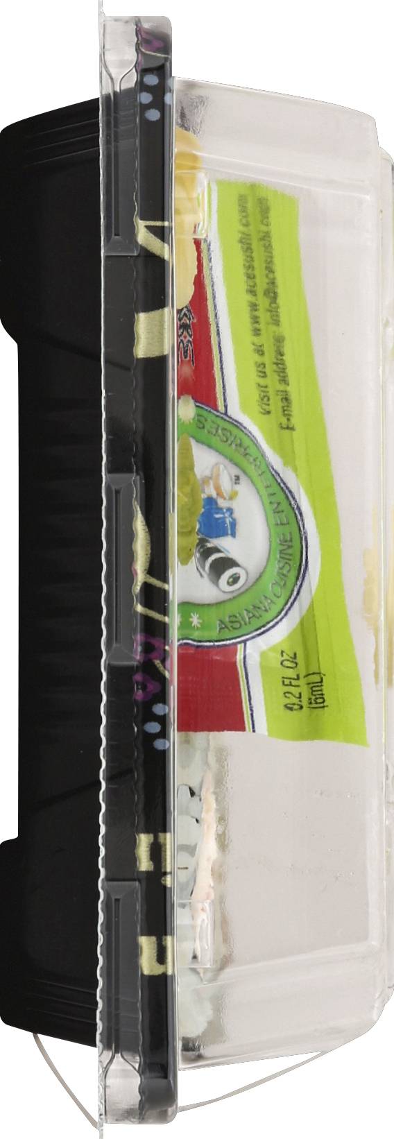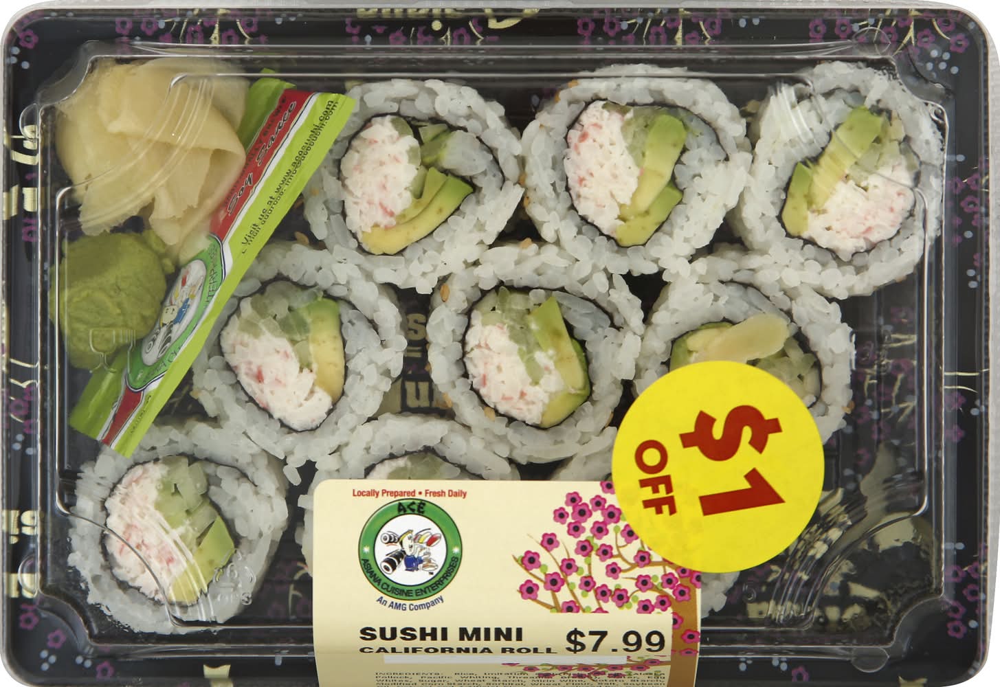 Ingredients: Rice, Imitation Crab (Fish Protein (Alaska Pollock, Pacific Whiting, Threadfin Bream), Water, Egg Whites, Sugar, Wheat Starch, Mirin Wine, Potato Starch, Modified Corn Starch, Sorbitol, Wheat Flour, Salt, Soybean Oil, Natural and Artificial Flavors (Hydrolyzed Soy Protein, Crab Extract), Soy Lecithin, Sodium Tripolyphosphate, Tetrasodium Pyrophosphate, Color Added, Carmine Color), Cucumber, Avocado, Vinegar (High Fructose Corn Syrup, Distilled Vinegar and Rice Vinegar (Diluted with Water), Salt and Brown Sugar), Wasabi (Horseradish, Corn Flour, Mustard, Ascorbic Acid (Vitamin C), Artificial Flavor, Artificial Color (FD&C Yellow 5, FD&C Blue 1)), Pickled Ginger (Ginger, Water, Vinegar, Salt, Acetic Acid, Citric Acid, Corn Syrup, Sorbitol, Aspartame, Potassium Sorbate, FD&C Red 40), Seaweed, Sesame Seed Contains: Eggs, Fish, Wheat