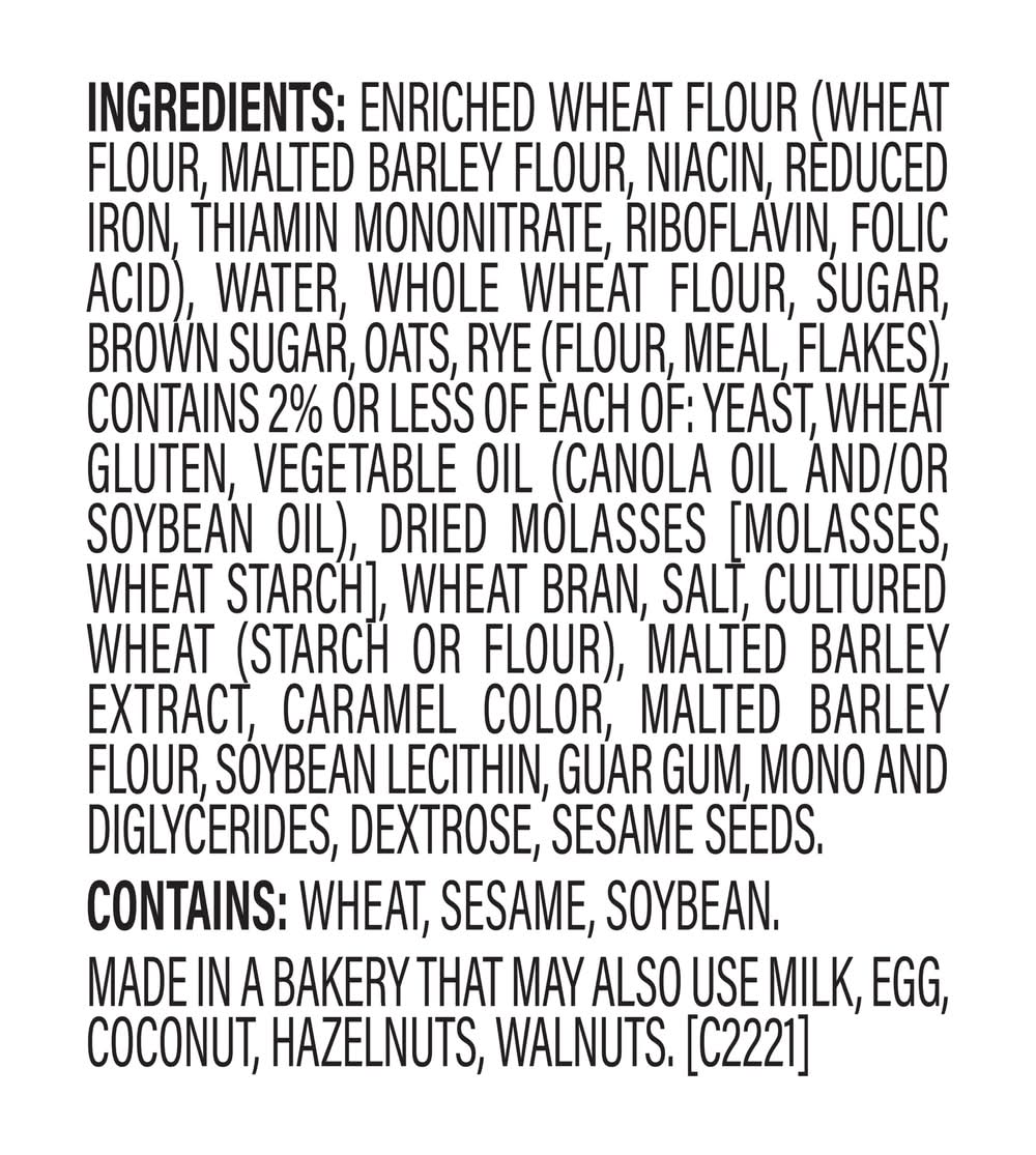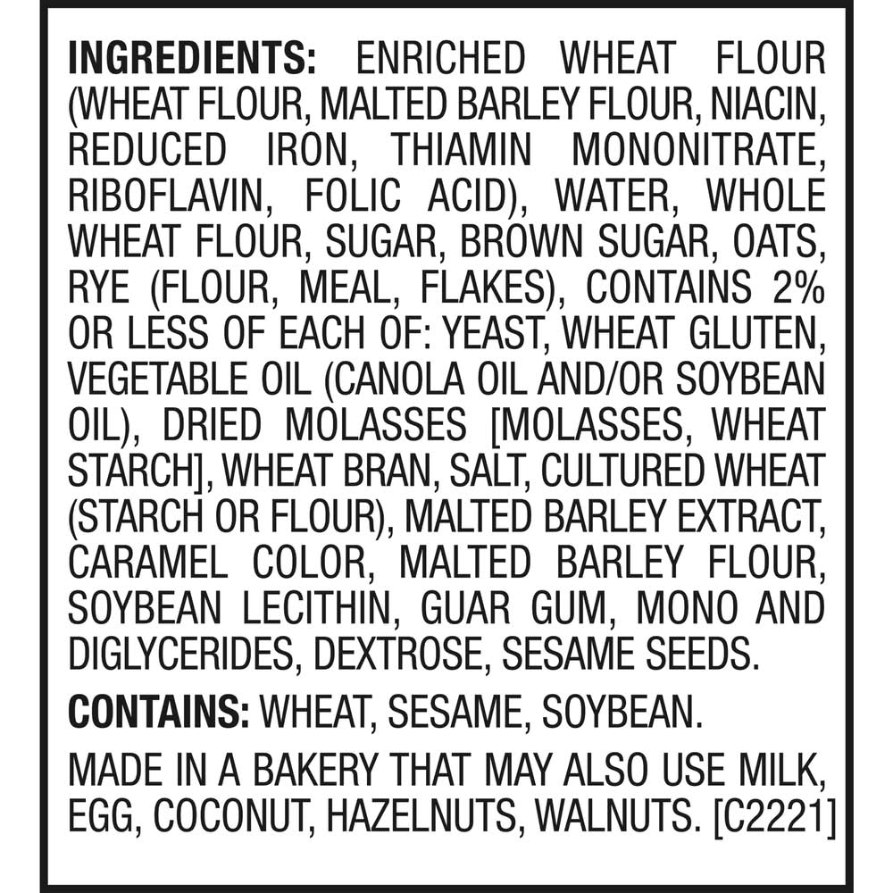 Ingredients: ENRICHED WHEAT FLOUR (WHEAT FLOUR, MALTED BARLEY FLOUR, NIACIN, REDUCED IRON, THIAMIN MONONITRATE, RIBOFLAVIN, FOLIC ACID), WATER, WHOLE WHEAT FLOUR, SUGAR, BROWN SUGAR, OATS, RYE (FLOUR, MEAL, FLAKES), CONTAINS 2% OR LESS OF EACH OF: YEAST, WHEAT GLUTEN, VEGETABLE OIL (CANOLA OIL AND/OR SOYBEAN OIL), DRIED MOLASSES [MOLASSES, WHEAT STARCH], WHEAT BRAN, SALT, CULTURED WHEAT (STARCH OR FLOUR), MALTED BARLEY EXTRACT, CARAMEL COLOR, MALTED BARLEY FLOUR, SOYBEAN LECITHIN, GUAR GUM, MONO AND DIGLYCERIDES, DEXTROSE, SESAME SEEDS. Contains: Wheat, Soybeans, Gluten, Milk, Eggs, Tree Nuts