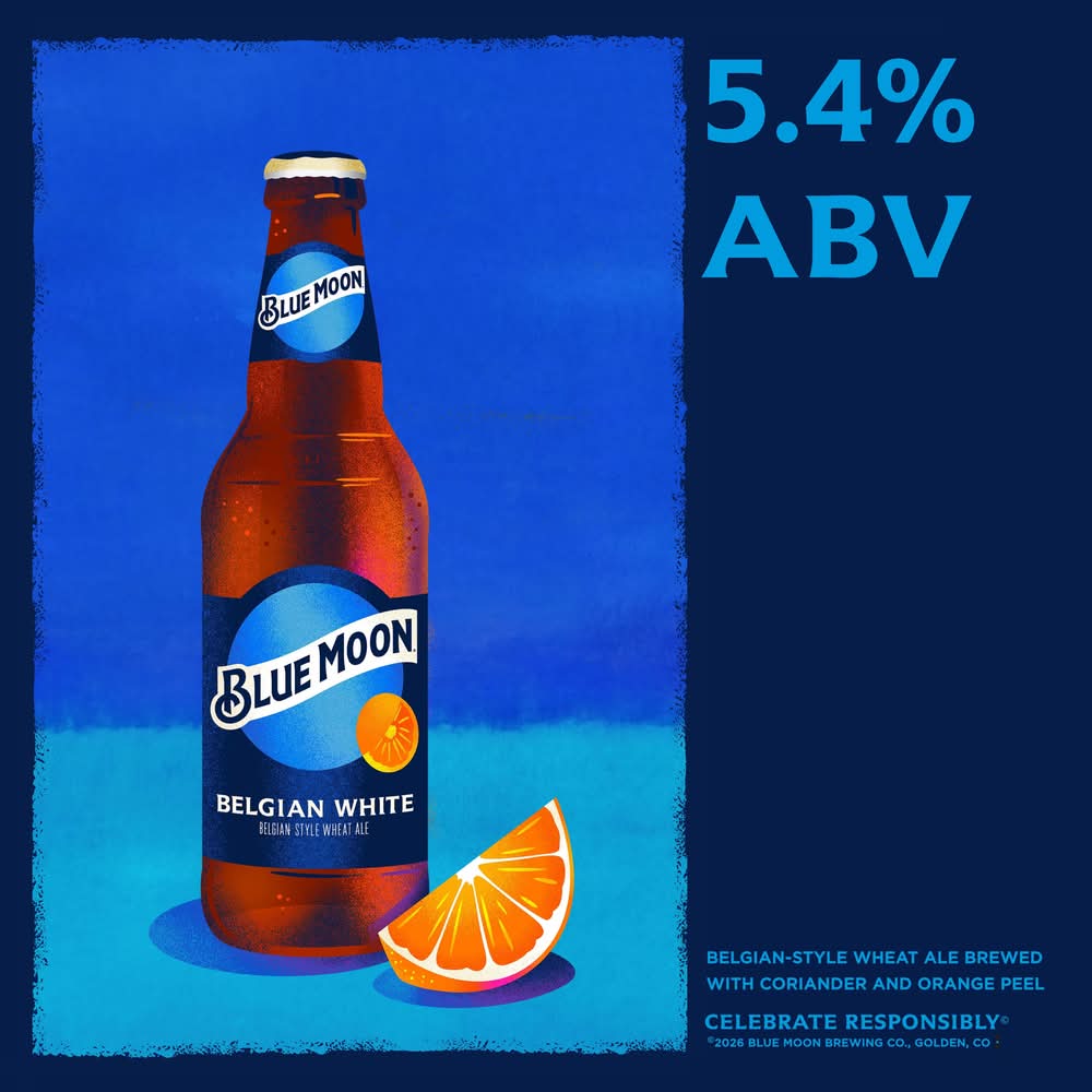 Crisp and tangy with subtle citrus sweetness, blue moon belgian white is a belgian-style wheat ale beer perfect for sharing. Full of zesty orange fruitiness, crafted with valencia orange peel, a touch of coriander, oats, and wheat, this light fruity beer provides a refreshing and balanced taste for every season. • Pack size: 6 • Alcohol by volume: 5.4% • Packaging: Reusable