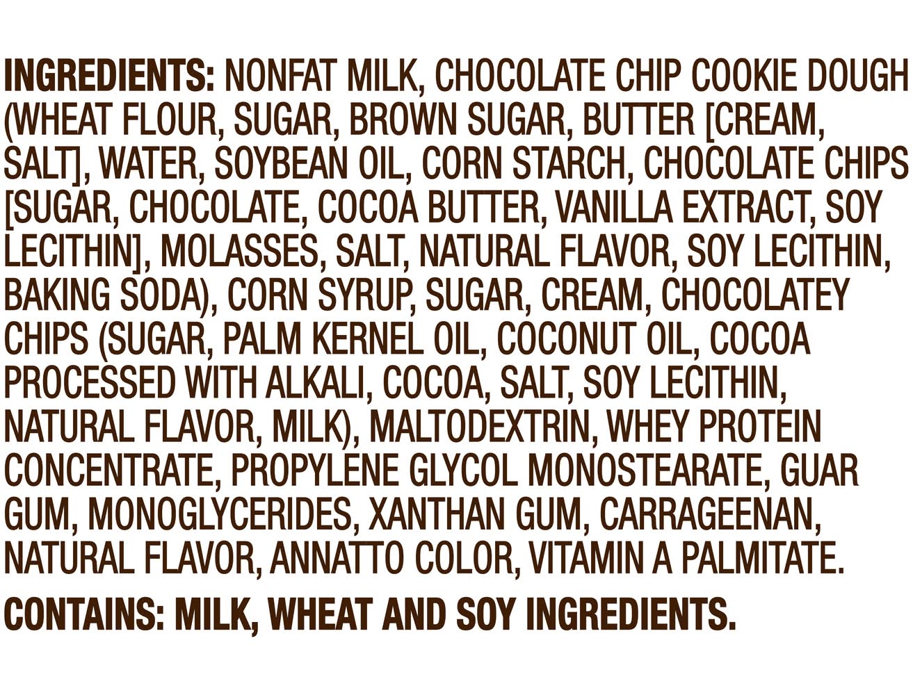 Ingredients: INGREDIENTSs: Non-fat milk, chocolate chip cookie dough (wheat flour; sugar; brown sugar; butter; water; soybean oil; chocolate chips [sugar; chocolate; cocoa butter; soy lecithin; vanilla extract]; corn starch; molasses; salt; natural flavor; soy lecithin; baking soda), corn syrup, sugar, cream, chocolatey chips (sugar; coconut oil; cocoa processed with alkali; palm kernel oil; cocoa powder; soy lecithin; salt; vanilla extract), maltodextrin, whey protein concentrate, propylene glycol monostearate, guar gum, monoglycerides, xanthan gum, carrageenan, natural flavor, annatto color, vitamin A palmitate Contains: CONTAINS: Milk; wheat and soy ingredients.