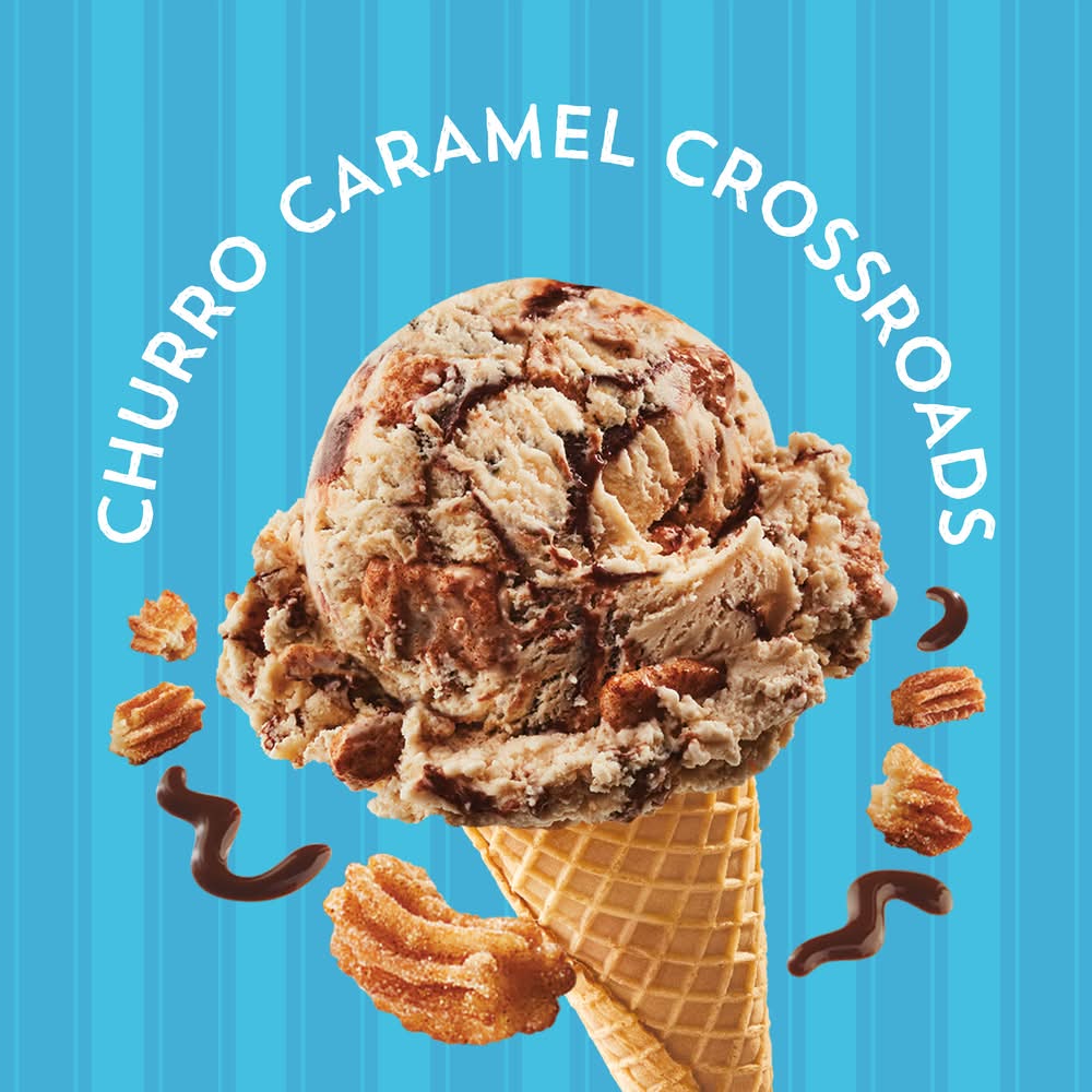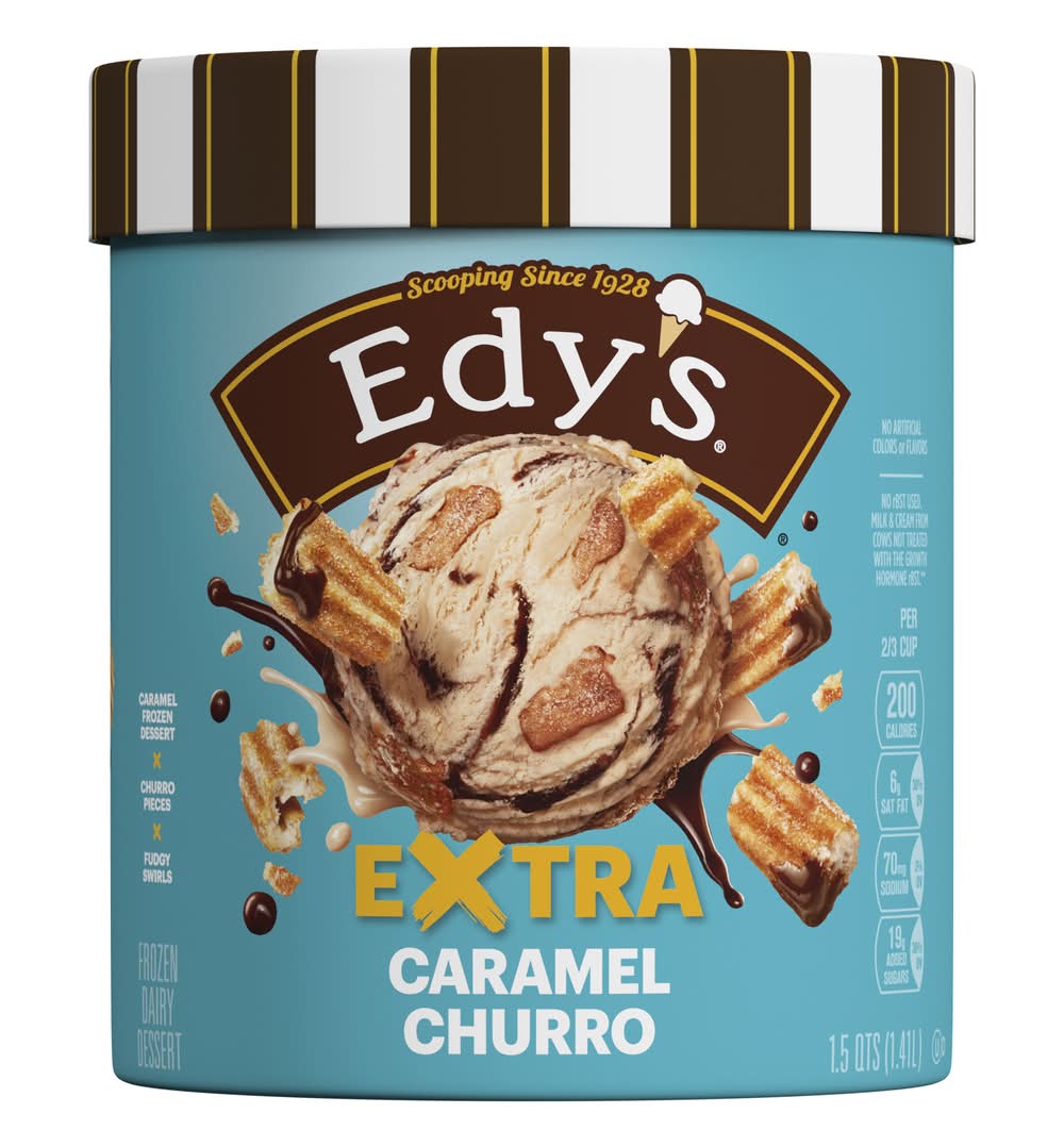 Hold tight for an Extra tasty adventure! Edy's/Dreyer's Extra Caramel Churro is exploding with flavor and filled with delicious mix-ins. Rich Edy’s/Dreyer's caramel is packed with rich fudge swirls and sweet churro pieces for a timeless blend of flavors. No artificial colors or flavors and no rBST used.* Dig in and share a container of Edy’s/Dreyer’s Extra Caramel Churro with the whole family. *Milk and cream from cows not treated with the growth hormone rBST. No significant difference has been shown between milk from rBST treated and non rBST treated cows.