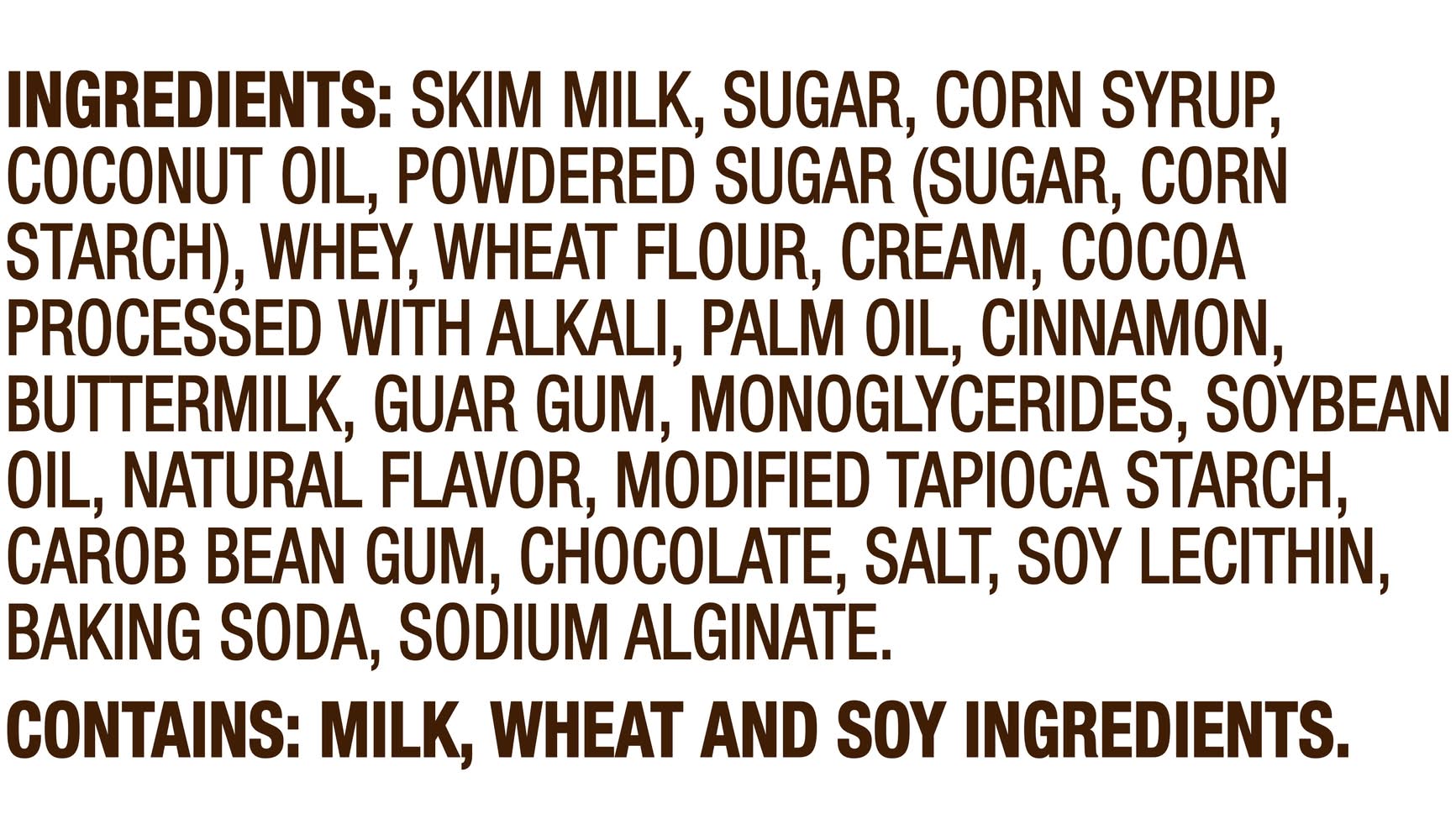 Ingredients: SKIM MILK, SUGAR, CORN SYRUP, COCONUT OIL, POWDERED SUGAR (SUGAR, CORN STARCH), WHEY, WHEAT FLOUR, CREAM, COCOA PROCESSED WITH ALKALI, PALM OIL, CINNAMON, BUTTERMILK, GUAR GUM, MONOGLYCERIDES, SOYBEAN OIL, NATURAL FLAVOR, MODIFIED TAPIOCA STARCH, CAROB BEAN GUM, CHOCOLATE, SALT, SOY LECITHIN, BAKING SODA, SODIUM ALGINATE. Contains: MILK, WHEAT AND SOY INGREDIENTS.