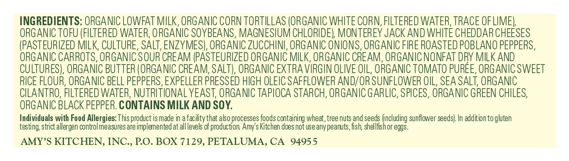 Ingredients: ORGANIC LOWFAT MILK, ORGANIC CORN TORTILLAS (ORGANIC WHITE CORN, FILTERED WATER, TRACE OF LIME), ORGANIC TOFU (FILTERED WATER, ORGANIC SOYBEANS, MAGNESIUM CHLORIDE), MONTEREY JACK AND WHITE CHEDDAR CHEESES (PASTEURIZED MILK, CULTURE, SALT, ENZYMES), ORGANIC ZUCCHINI, ORGANIC ONIONS, FIRE ROASTED POBLANO PEPPERS, ORGANIC CARROTS, ORGANIC SOUR CREAM (PASTEURIZED ORGANIC CREAM, ORGANIC NONFAT DRY MILK AND CULTURES), ORGANIC BUTTER (ORGANIC CREAM, SALT), ORGANIC EXTRA VIRGIN OLIVE OIL, ORGANIC TOMATO PURÉE, ORGANIC SWEET RICE FLOUR, ORGANIC BELL PEPPERS, EXPELLER PRESSED HIGH OLEIC SAFFLOWER AND/OR SUNFLOWER OIL, SEA SALT, ORGANIC CILANTRO, FILTERED WATER, NUTRITIONAL YEAST, ORGANIC TAPIOCA STARCH, ORGANIC GARLIC, SPICES, ORGANIC GREEN CHILES, ORGANIC BLACK PEPPER. CONTAINS MILK AND SOY. Contains: 'Milk Contains', 'Soybeans Contains', 'Corn Contains', 'Wheat May Contain', 'Tree Nuts May Contain'