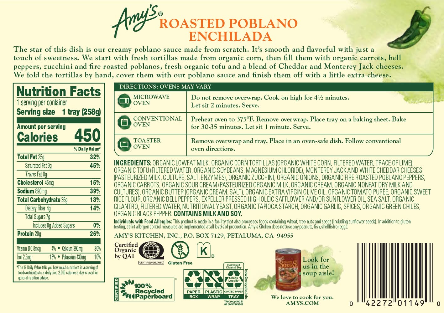 The star of this dish is our creamy poblano sauce made from scratch. It's smooth and flavorful with just a touch of sweetness. We start with fresh tortillas made from organic corn, then fill them with organic carrots, bell peppers, zucchini and fire roasted poblanos, fresh organic tofu and a blend of Cheddar and Monterey Jack cheeses. We fold the tortillas by hand, cover them with our poblano sauce and finish them off with a little extra cheese. Family owned since 1987. After the birth of our daughter Amy in 1987, we found there was little time to prepare the quality homemade food we normally ate. Realizing there were others like ourselves, we started Amy's Kitchen to prepare delicious meals for those who care about the food they eat but are often too busy to cook. We use only the finest ingredients and prepare them with the same careful attention in our kitchen as you would in your own home. No meat, fish, shellfish, poultry, eggs or peanuts are ever used in any Amy's products. From our home to yours. • Number of servings: 1 • Packaging: Reusable