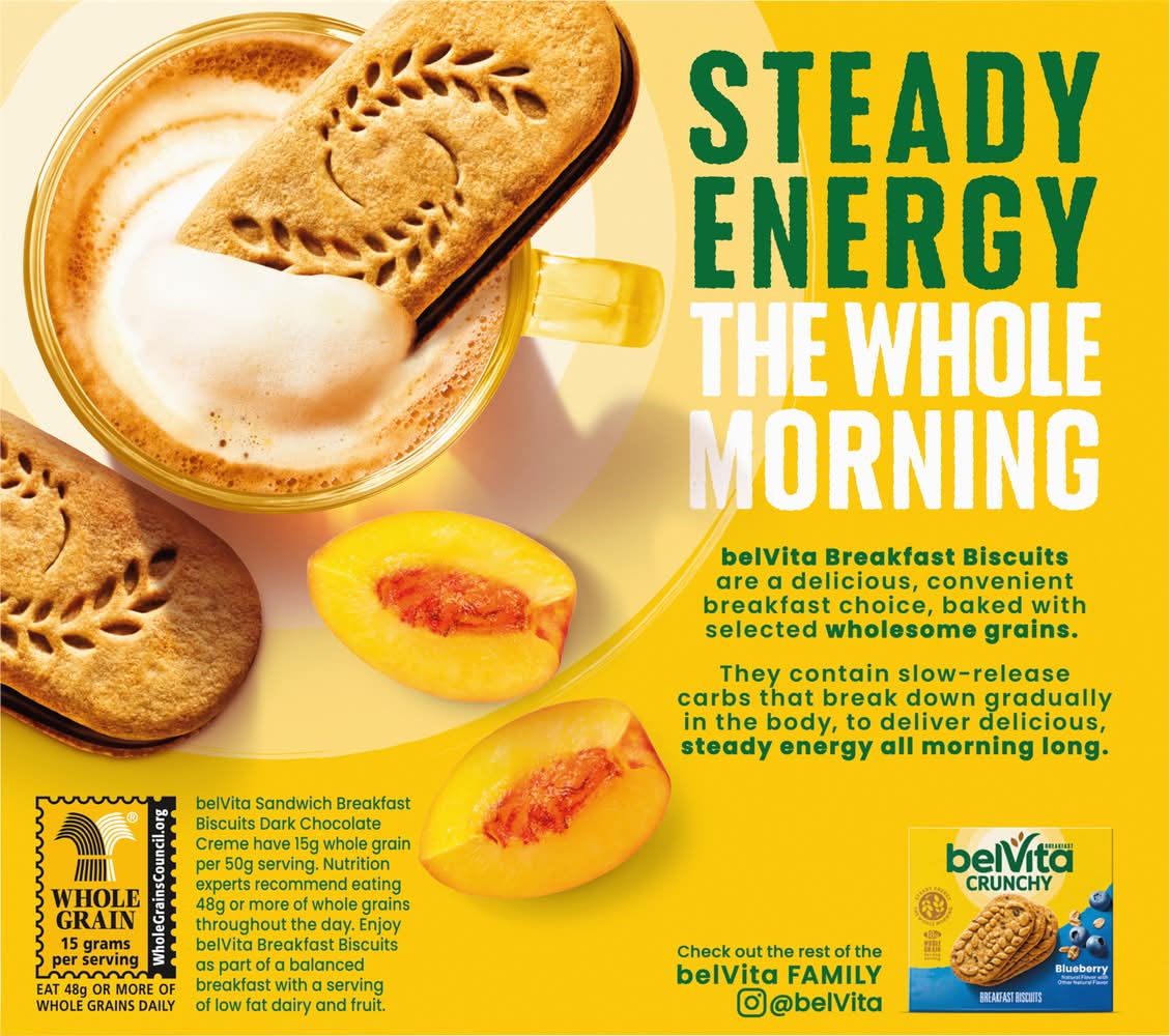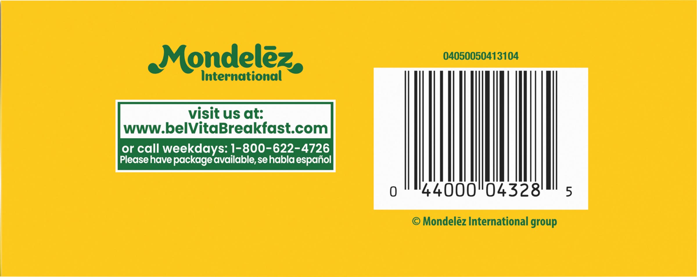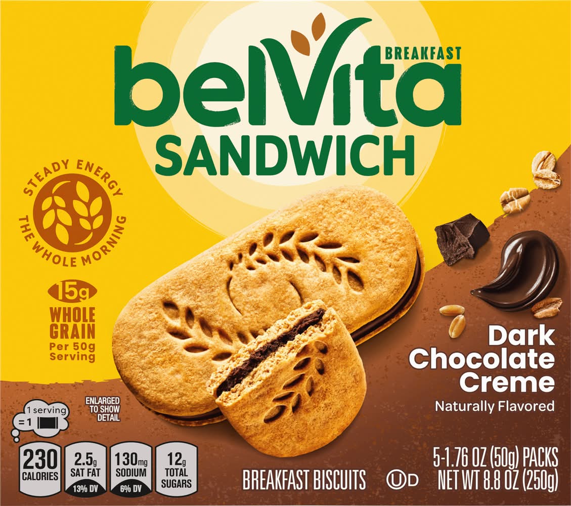 Belvita Dark Chocolate Creme Breakfast Biscuits offer a satisfying start to the day with a rich dark chocolate flavored creme nestled between two lightly sweetened biscuits. Crafted to provide sustained energy, these biscuits feature slow-release carbohydrates. Free from cholesterol, high-fructose corn syrup, artificial colors, flavors, and sweeteners, they are made with wholesome grains. Ideal for a convenient on-the-go meal or a complement to your morning coffee, each pack contains two biscuits that can be enjoyed anywhere, whether at home or in the office. • Flavor: Dark chocolate creme • Pack size: 5 • Mondelez Global LLC, East Hanover,NJ,07936 • Packaging: Reusable