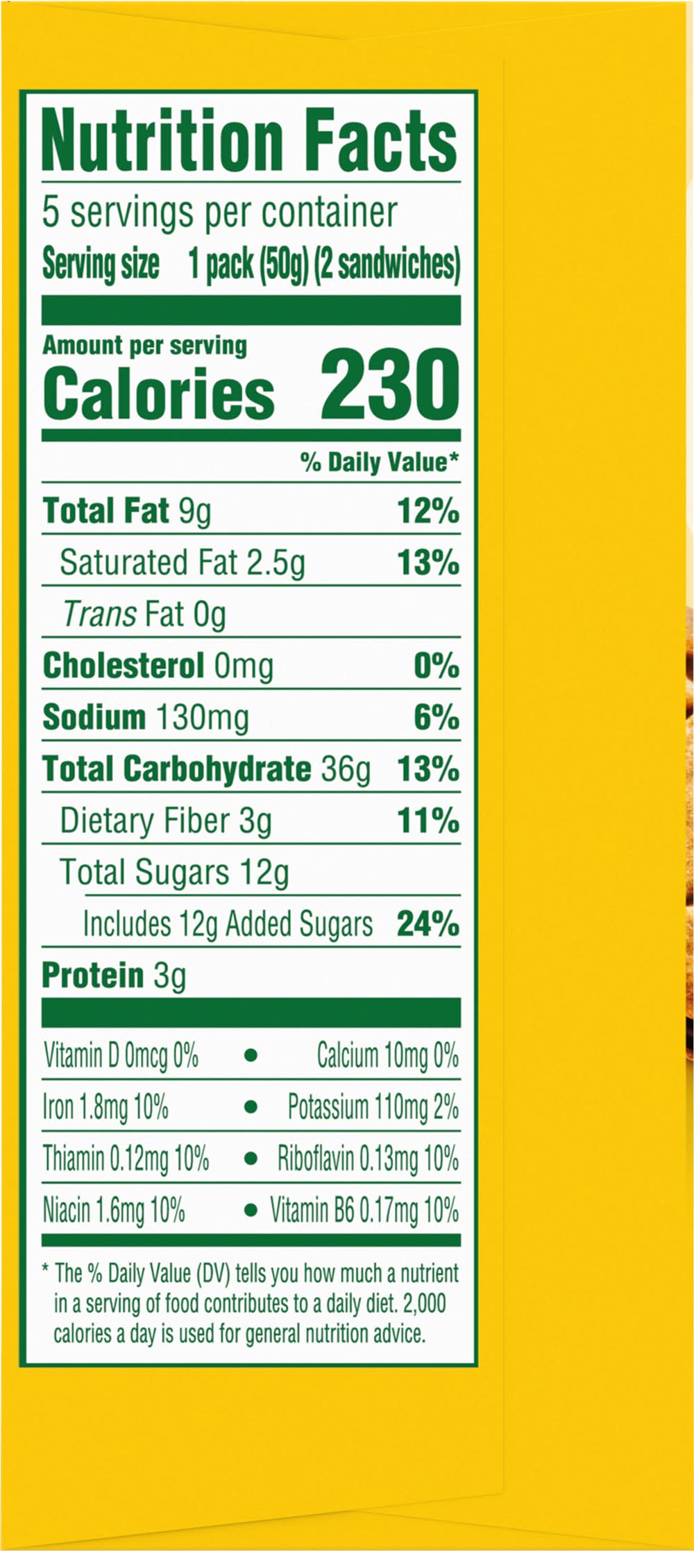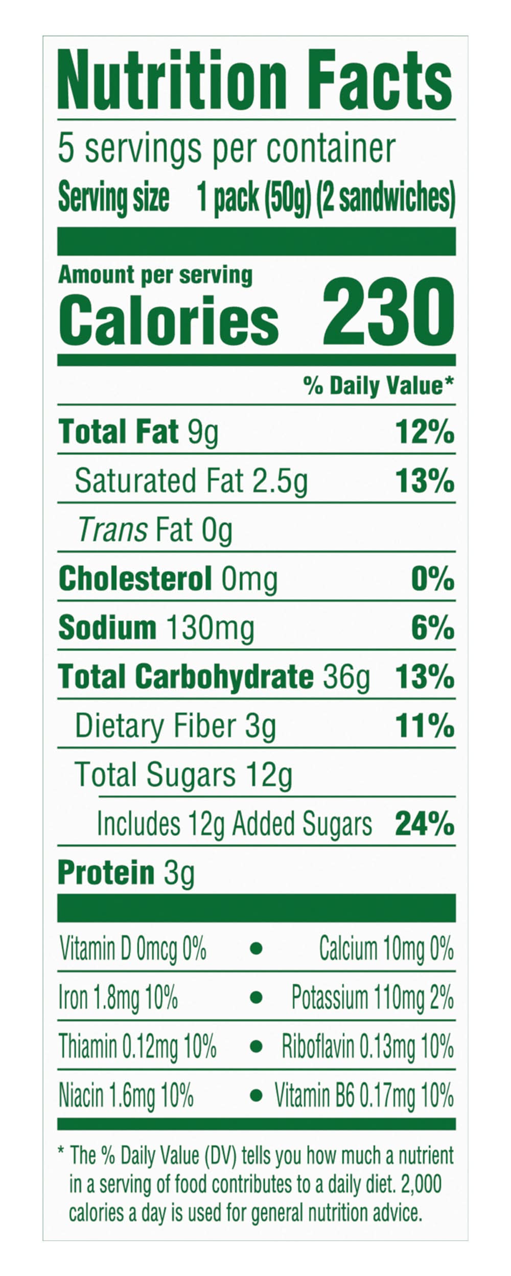 Ingredients: Whole Grain Wheat Flour, Sugar, Enriched Flour [Wheat Flour, Niacin, Reduced Iron, Thiamin Mononitrate Vitamin B1, Riboflavin Vitamin B2, Folic Acid], Palm Oil, Wheat Starch, Canola Oil, Whole Grain Blend Rolled Oats, Rye Flakes, Cocoa, Malt Syrup from Corn and Barley, Oligofructose, Soy Lecithin, Baking Soda, Chocolate, Salt, Disodium Pyrophosphate, DATEM, Natural Flavor, Ferric Orthophosphate Iron, Niacinamide, Pyridoxine Hydrochloride Vitamin B6, Riboflavin Vitamin B2, Thiamin Mononitrate Vitamin B1. Contains: Wheat, Soybeans