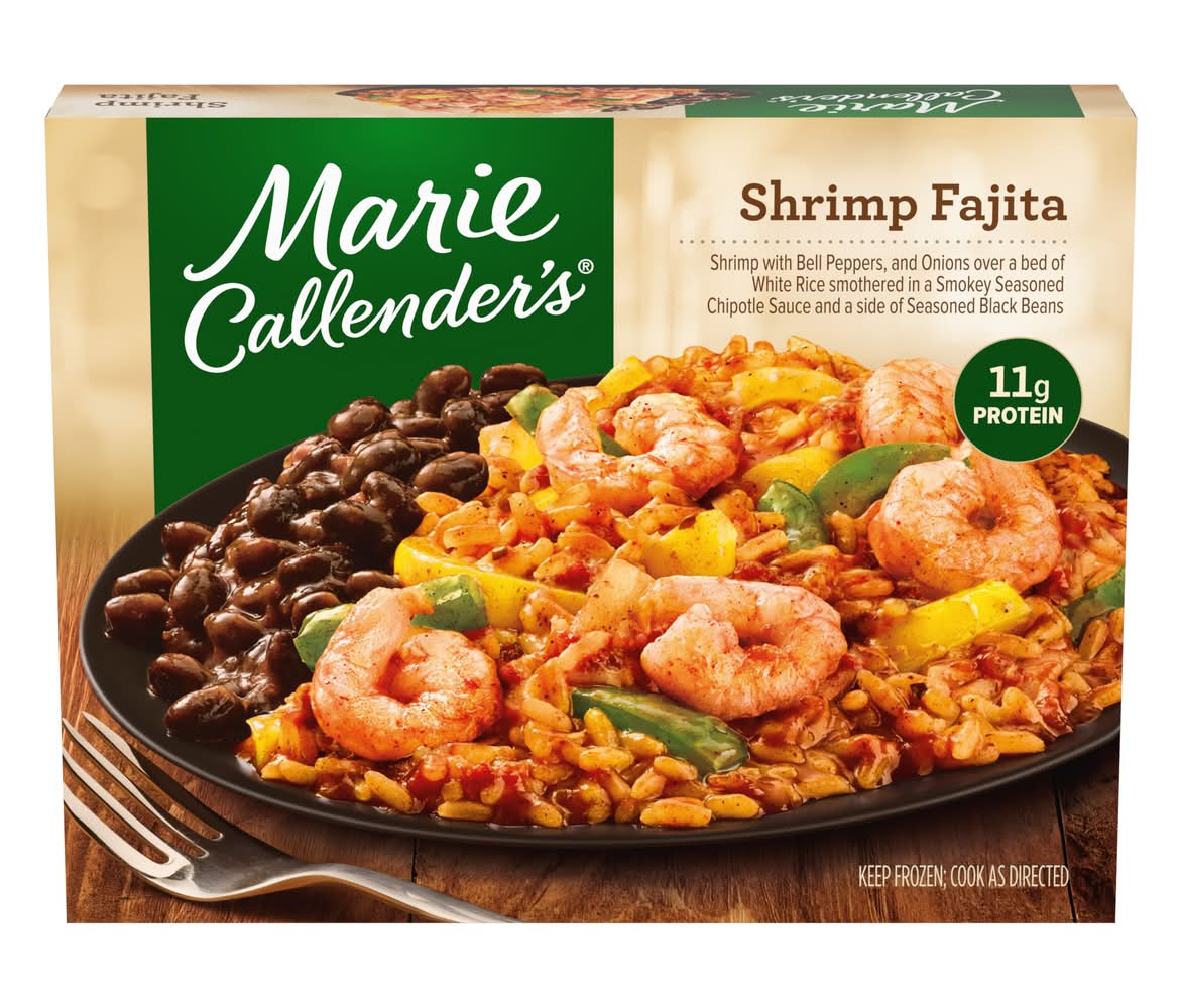 Put the taste of homemade flavor on your table with Marie Callender's Shrimp Fajita. Marie Callender's frozen dinners are convenient meals that bring back the homestyle cooking you crave. Featuring succulent shrimp, bell peppers, onions, rice smothered in a smokey seasoned chipotle sauce and a side of black beans, this frozen meal offers a warm, savory taste. This frozen shrimp dinner is made with wholesome ingredients and no artificial flavors and contains 10 grams of protein per serving. For microwave preparation, microwave this frozen dinner for 3 minutes, stir, re-cover and cook an additional 1 1/2 to 2 1/2 minutes. Check that the food is cooked thoroughly before eating. For conventional oven preparation, place ready made meals in an oven heated to 350 degrees and bake for 35 to 38 minutes, let stand for 2 minutes, and check that food is cooked thoroughly before eating. Whether you're feeding yourself or the whole family, Marie Callender's frozen dinners are perfect quick meals for any occasion. This 11.5 oz Marie Callender's Chicken Fajita frozen meal should be kept in your freezer until ready to prepare. Enjoy the combination of warm, hearty and delicious ingredients in Marie Callender's frozen entrees and microwave meals for a homemade, comfort food taste. Packaging: Reusable
