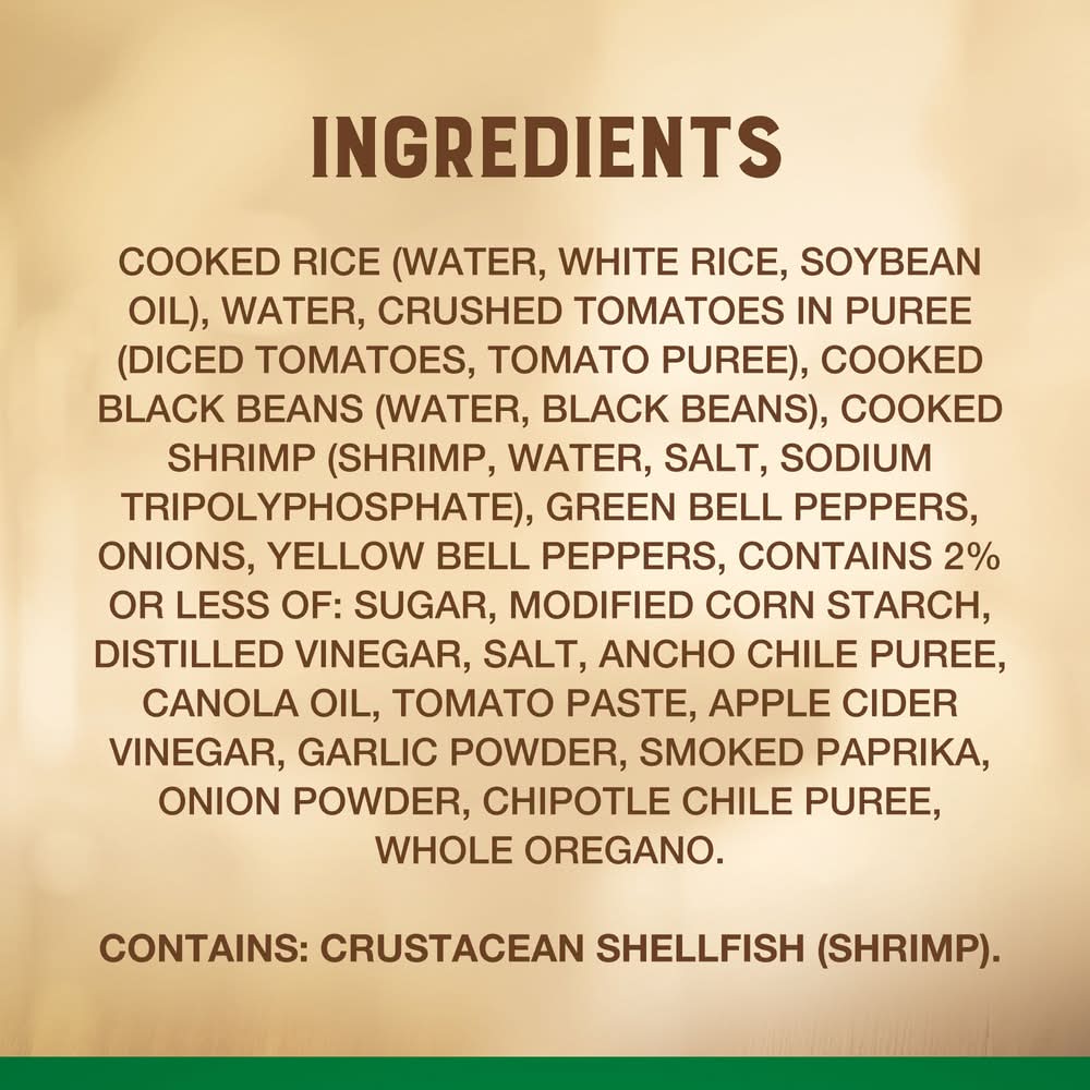 Directions for use: Microwave Oven: Cook only one at a time. 1. Cut film to vent. 2. Cook on high 3 minutes. 3. Stir rice and shimp; re-cover. 4. Cook an additional 1 1/2 to 2 1/2 minutes. 5. Check that food is cooked thoroughly. Handle carefully; It's hot! Let stand 2 minutes; enjoy! Conventional Oven: Do not prepare in toaster oven. Preheat oven to 350 degrees F. Cut film to vent. Cook on baking sheet in center of oven 35 to 38 minutes. Check that food is cooked thoroughly. Handle carefully; It's hot! Let stand 2 minutes; enjoy! Must be cooked thoroughly. For Food Safety and Quality: Keep frozen. Do not thaw. Microwave directions developed with 1100-watt microwave ovens. Appliances vary. Adjust cooking times as needed. Food must be cooked thoroughly to 165 degrees F. Keep frozen. Push to open. Storage recommendation: Keep frozen.