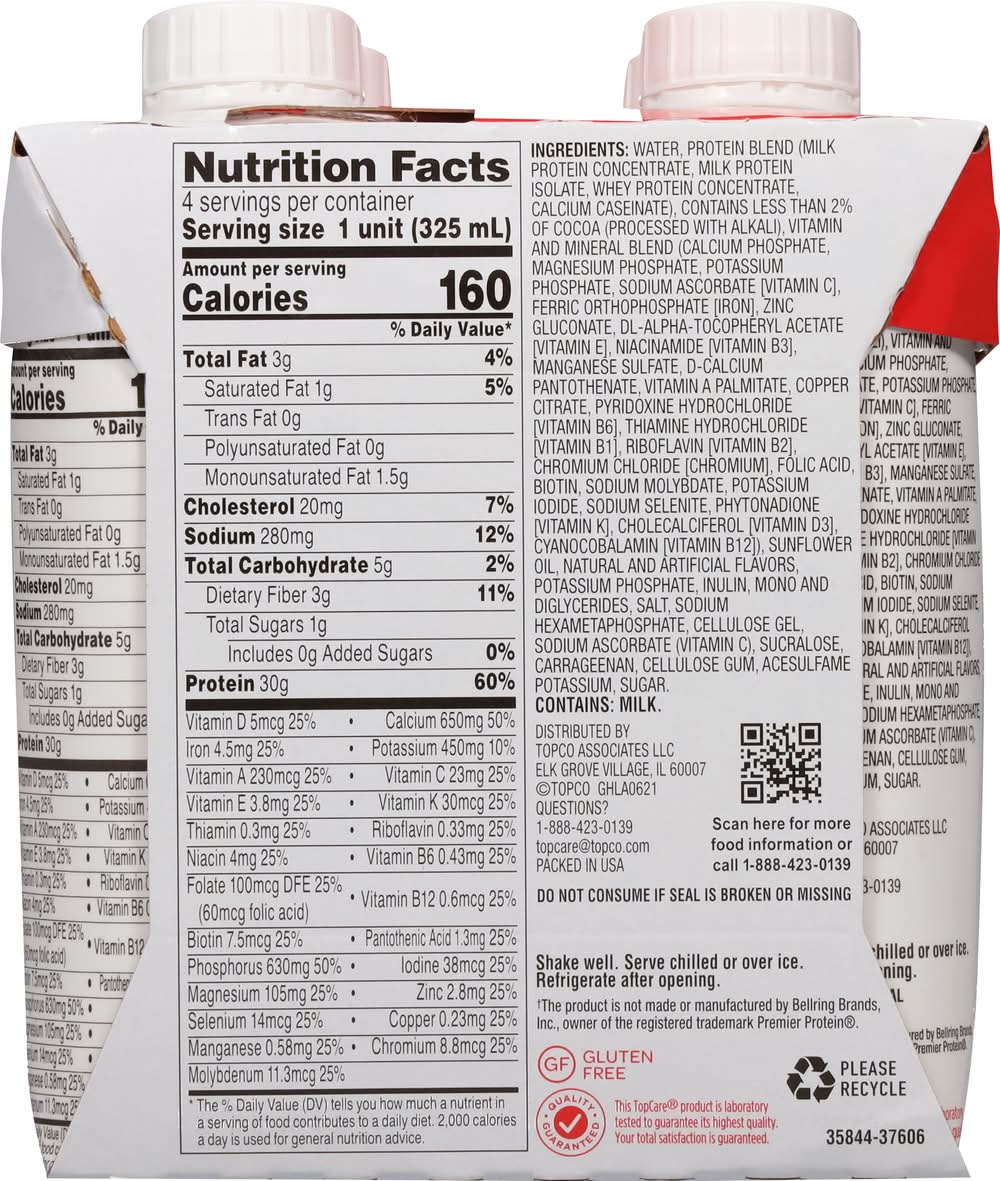 Ingredients: Water, Protein Blend (Milk Protein Concentrate, Milk Protein Isolate, Whey Protein Concentrate, Calcium Caseinate), Contains Less than 2% of Cocoa (Processed with Alkali), Vitamin and Mineral Blend (Calcium Phosphate, Magnesium Phosphate, Potassium Phosphate, Sodium Ascorbate [Vitamin C], Ferric Orthophosphate [Iron], Zinc Gluconate, DL-Alpha-Tocopheryl Acetate [Vitamin E], Niacinamide [Vitamin B3], Manganese Sulfate, D-Calcium Pantothenate, Vitamin A Palmitate, Copper Citrate, Pyridoxine Hydrochloride [Vitamin B6], Thiamine Hydrochloride [Vitamin B1], Riboflavin [Vitamin B2], Chromium Chloride [Chromium], Folic Acid, Biotin, Sodium Molybdate, Potassium Iodide, Sodium Selenite, Phytonadione [Vitamin K], Cholecalciferol [Vitamin D3], Cyanocobalamin [Vitamin B12]), Sunflower Oil, Natural and Artificial Flavors, Potassium Phosphate, Inulin, Mono and Diglycerides, Salt, Sodium Hexametaphosphate, Cellulose Gel, Sodium Ascorbate (Vitamin C), Sucralose, Carrageenan, Cellulose Gum, Acesulfame Potassium, Sugar Contains: Milk