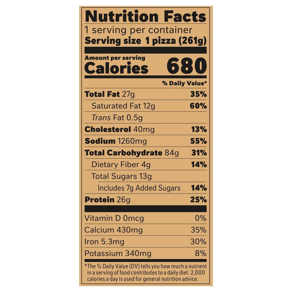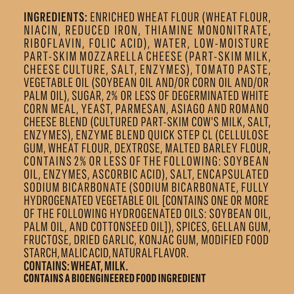 Ingredients: ENRICHED WHEAT FLOUR (WHEAT FLOUR, NIACIN, REDUCED IRON, THIAMINE MONONITRATE, RIBOFLAVIN, AND FOLIC ACID), WATER, LOW-MOISTURE PART-SKIM MOZZARELLA CHEESE (PART-SKIM MILK, CHEESE CULTURE, SALT, ENZYMES), TOMATO PASTE, VEGETABLE OIL (SOYBEAN OIL AND/OR CORN OIL AND/OR PALM OIL), SUGAR, 2% OR LESS OF DEGERMINATED WHITE CORN MEAL, YEAST, PARMESAN, ASIAGO AND ROMANO CHEESE BLEND (CULTURED PART-SKIM COW'S MILK, SALT, ENZYMES), ENZYME BLEND QUICK STEP CL (CELLULOSE GUM, WHEAT FLOUR, DEXTROSE, MALTED BARLEY FLOUR, CONTAINS 2% OR LESS OF THE FOLLOWING: SOYBEAN OIL, ENZYMES, ASCORBIC ACID), SALT, ENCAPSULATED SODIUM BICARBONATE (SODIUM BICARBONATE, FULLY HYDROGENATED VEGETABLE OIL [CONTAINS ONE OR MORE OF THE FOLLOWING HYDROGENATED OILS: SOYBEAN OIL, PALM OIL, AND COTTONSEED OIL]), SPICES, GELLAN GUM, FRUCTOSE, DRIED GARLIC, KONJAC GUM, MODIFIED FOOD STARCH, MALIC ACID, NATURAL FLAVOR. Contains: CONTAINS: WHEAT, MILK.