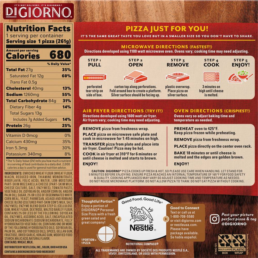 Directions for use: Cook thoroughly. Microwave Directions (Fastest!): Directions developed using 1100 watt microwave oven. Ovens vary; cooking time may need adjusting. Step 1: Pull perforated tear strip on side of box. Step 2: Open carton top along perforations. Fold around box to create a platform. Silver surface should be facing up. Step 3: Remove plastic overwrap. Place pizza on silver surface. Step 4: Cook 3 minutes on high until cheese is melted. Step 5: Enjoy! Air Fryer Directions (Try It): Directions developed using 1600 watt air fryer. Air fryers vary; cooking time may need adjusting. Remove pizza from freshness wrap. Place pizza on microwave safe plate and cook for 1:45 minutes on high. Transfer pizza from plate and place into air fryer. Caution! Pizza may be hot. Cook at 310 degrees F for 6 minutes or until cheese is melted and starts to brown. Enjoy! Oven Directions (Crispiest!): Preheat oven to 425 degrees F. Keep pizza frozen while preheating. Remove pizza from freshness wrap. Place pizza directly on the center rack. Bake 18 minutes or until cheese is melted and the edges are golden brown. Enjoy! Caution: Digiorno Pizza cooks up fresh & hot, so please use care when handling. Let stand for 5 minutes before enjoying. Ensure pizza reaches an internal temperature of 165 degrees F for food safety & quality. Cooking appliances may vary so adjust cooking time and temperature as needed. Do not reuse microwave platform. Do not allow pizza to thaw. Do not eat pizza without cooking. Keep frozen. Pull tab for fresh baked taste. Storage recommendation: Keep frozen.