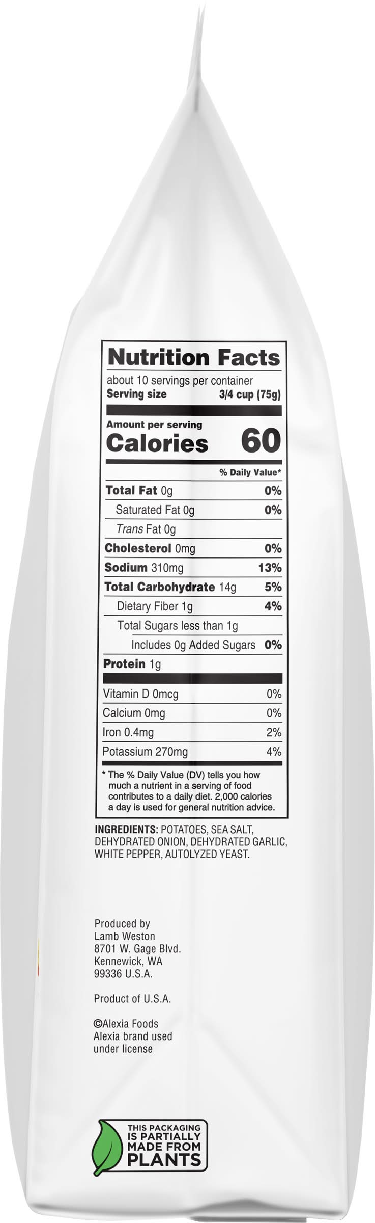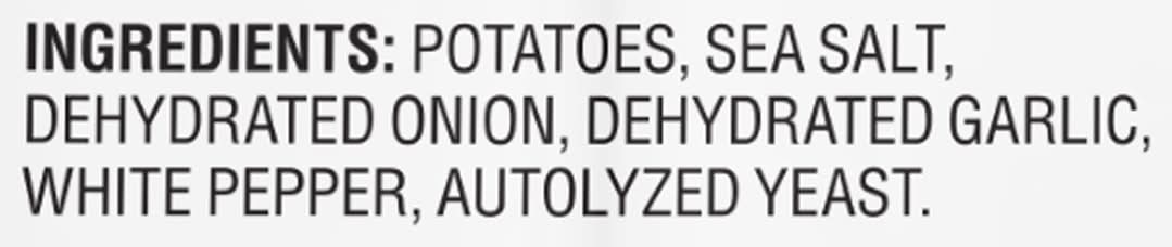 Ingredients: Potato, Sea Salt, Dehydrated Onion, Dehydrated Garlic, White Pepper, Autolyzed Yeast