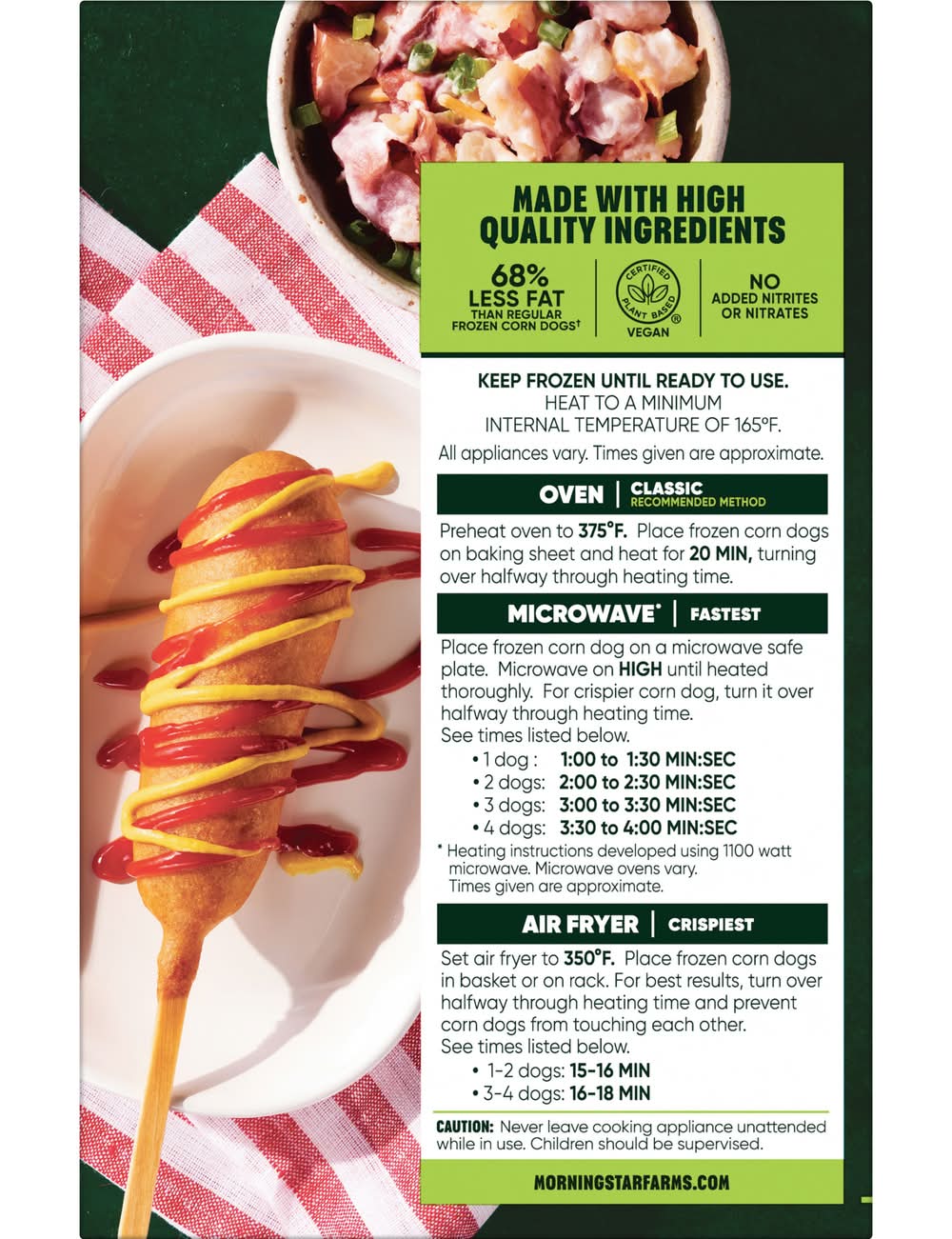 A delicious vegan alternative or part of a savory meal, MorningStar Farms corn dogs are plant-based and feature a delicious, hot-off-the-grill taste with a sweet and crisp coating. With 68% less fat than regular frozen corn dogs, these meat alternative corn dogs are low in saturated fat (contains 2.5g total fat per serving) and are cholesterol free (contains 1g monounsaturated fat and 1.5g polyunsaturated fat per serving, see nutrition information for sodium content); Pair these corn dogs with your favorite dips and summer sides. Whether you're seeking a quick lunch or a hearty dinner starter, or a fun food for game time, parties, or after school, MorningStar Farms corn dogs are sure to delight vegans and meat-lovers alike. • Kellogg sales co., Battle Creek,MI,49016 • Packaging: Reusable
