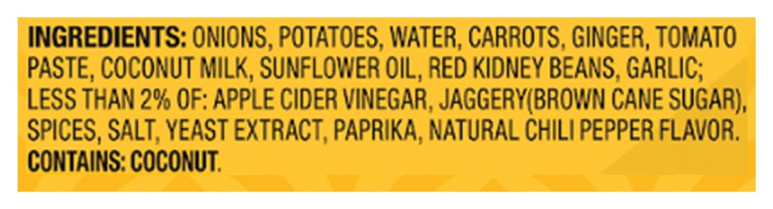Ingredients: Onions, Potatoes, Water, Carrots, Ginger, Tomato Paste, Coconut Milk, Sunflower Oil, Red Kidney Beans, Garlic, Less than 2% of: Apple Cider Vinegar, Jaggery (Brown Cane Sugar), Spices, Salt, Yeast Extract, Paprika, Natural Chili Pepper Flavor Contains: Tree Nuts, Coconuts, Milk, Tree Nuts, Cashews, Wheat, Peanuts, Soybeans, Sesame