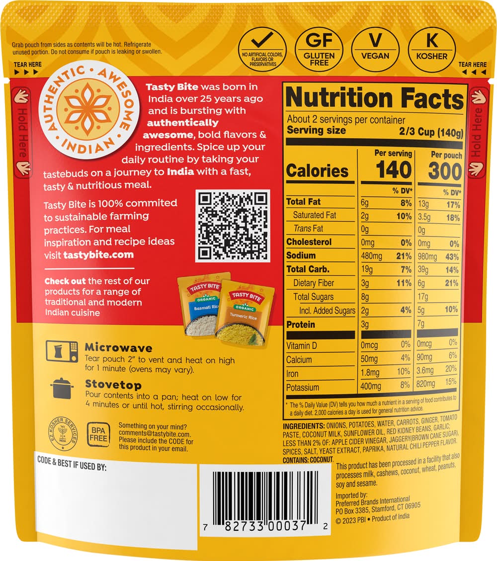 Directions for use: Microwave: Tear pouch 2 inches to vent and heat on high for 1 minute (ovens may vary). Stovetop: Pour contents into a pan; heat on low for 4 minutes or until hot, stirring occasionally. Serve as is, with Tasty Bite Rice or with flatbread! Grab pouch from sides as contents will be hot. Refrigerate unused portion. Do not consume if pouch is leaking or swollen. Refrigerate unused portion. Tear here hold here. Storage recommendation: Refrigerate unused portion.