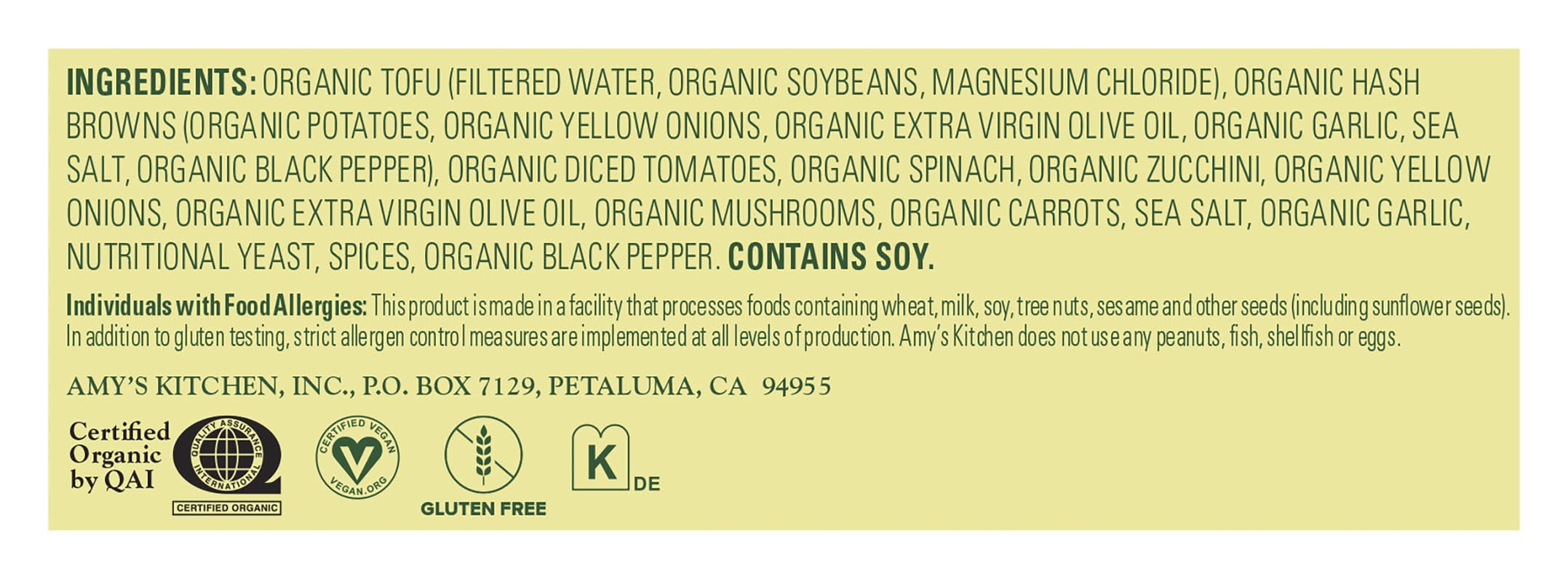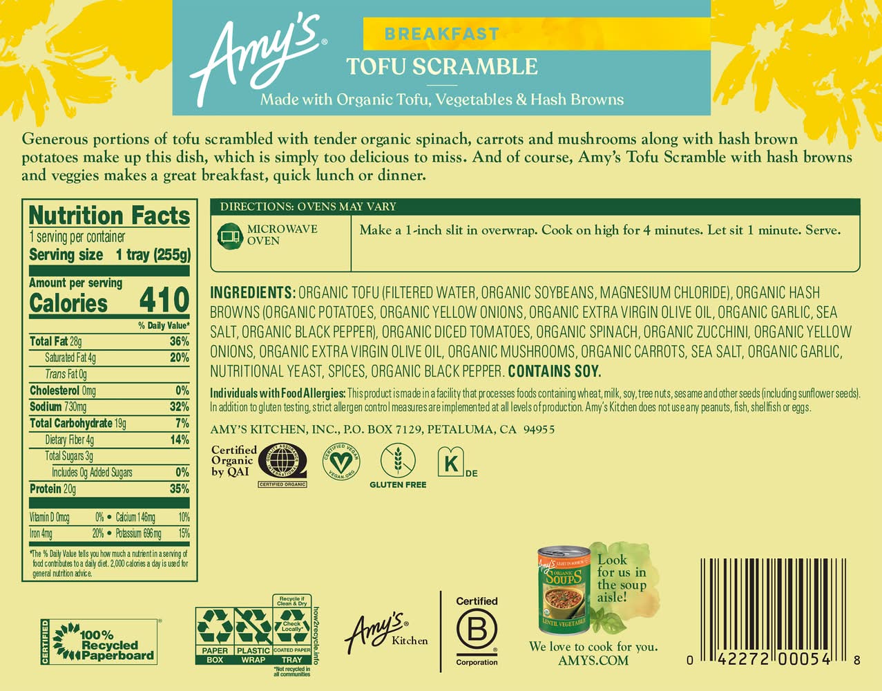 Tofu Scramble • Amy's Kitchen, Inc., PO Box 7129,Petaluma,CA,94955 • Packaging: Reusable