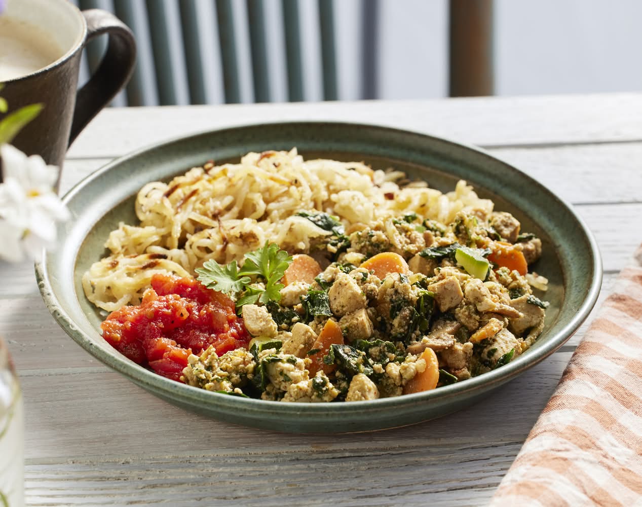 Ingredients: ORGANIC TOFU (FILTERED WATER, ORGANIC SOYBEANS, MAGNESIUM CHLORIDE), ORGANIC HASH BROWNS (ORGANIC POTATOES, ORGANIC YELLOW ONIONS, ORGANIC EXTRA VIRGIN OLIVE OIL, ORGANIC GARLIC, SEA SALT, ORGANIC BLACK PEPPER), ORGANIC DICED TOMATOES, ORGANIC SPINACH, ORGANIC ZUCCHINI, ORGANIC YELLOW ONIONS, ORGANIC EXTRA VIRGIN OLIVE OIL, ORGANIC MUSHROOMS, ORGANIC CARROTS, SEA SALT, ORGANIC GARLIC, NUTRITIONAL YEAST, SPICES, ORGANIC BLACK PEPPER. CONTAINS SOY. Contains: soybeans, wheat, milk, treenuts,