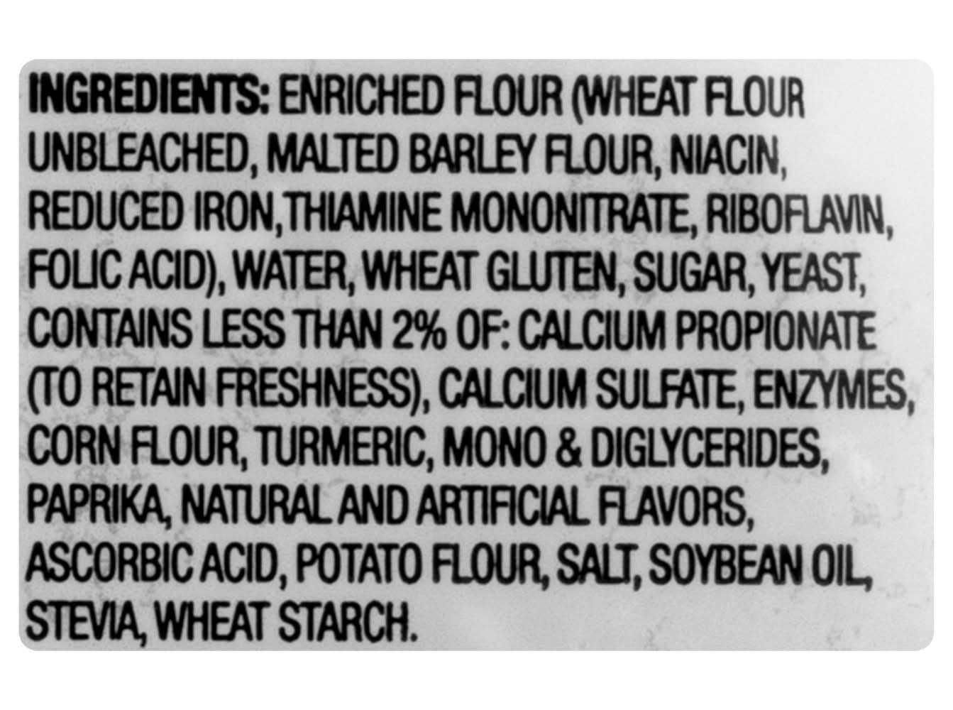 Ingredients: Enriched Flour (Wheat Flour Unbleached, Malted Barley Flour, Niacin, Reduced Iron, Thiamine Mononitrate, Riboflavin, Folic Acid), Water, Wheat Gluten, Sugar, Yeast, Contains Less than 2% of: Calcium Propionate (to Retain Freshness), Calcium Sulfate, Enzymes, Corn Flour, Turmeric, Mono & Diglycerides, Paprika, Natural and Artificial, Flavors, Ascorbic Acid, Potato Flour, Salt, Soybean Oil Stevia, Wheat Starch Contains: Wheat, Gluten, Soybeans, Sesame
