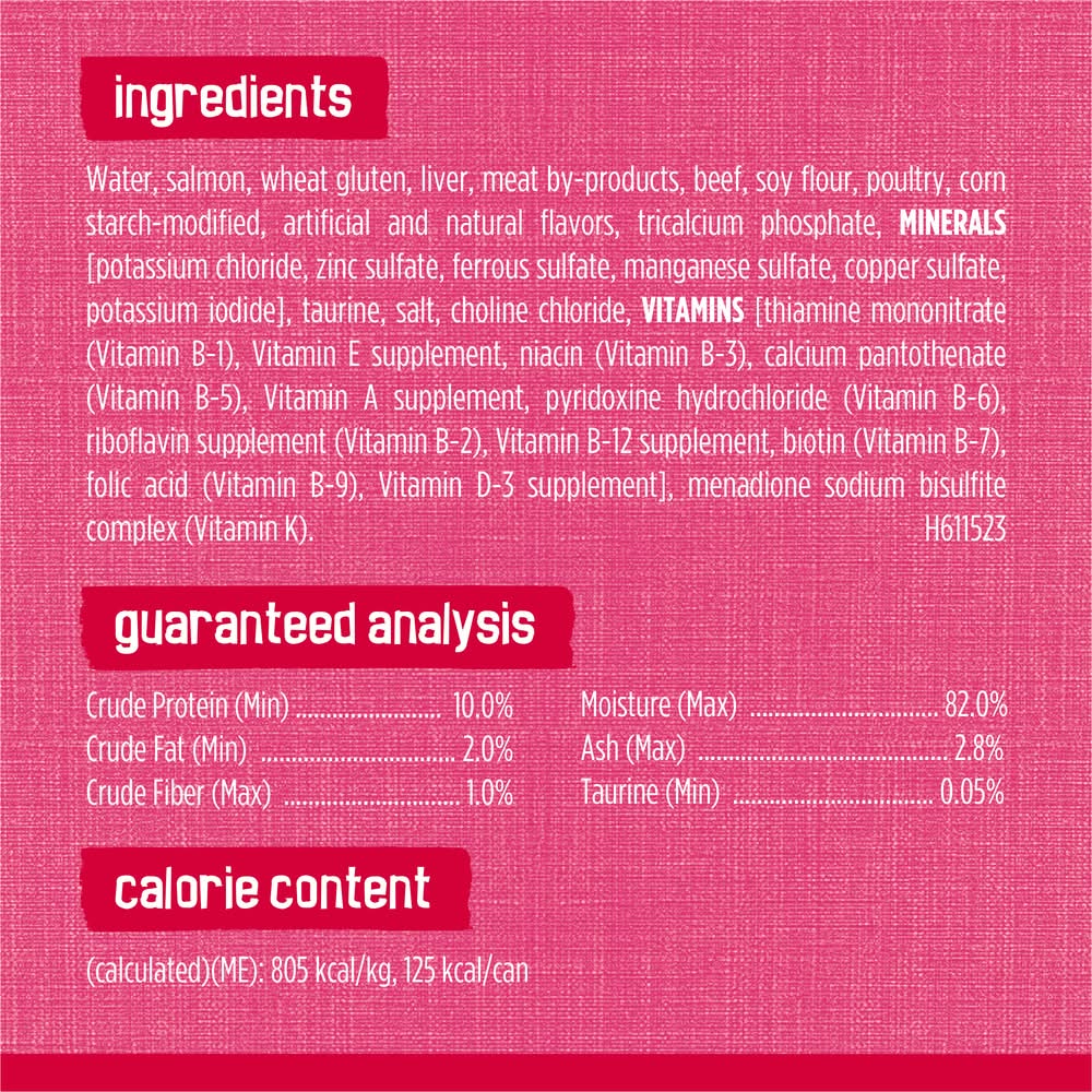 Ingredients: Water, Salmon, Wheat Gluten, Liver, Meat By-Products, Beef, Soy Flour, Poultry, Corn Starch-Modified, Artificial And Natural Flavors, Tricalcium Phosphate, MINERALS [Potassium Chloride, Zinc Sulfate, Ferrous Sulfate, Manganese Sulfate, Copper Sulfate, Potassium Iodide], Taurine, Salt, Choline Chloride, VITAMINS [Thiamine Mononitrate (Vitamin B-1), Vitamin E Supplement, Niacin (Vitamin B-3), Calcium Pantothenate (Vitamin B-5), Vitamin A Supplement, Pyridoxine Hydrochloride (Vitamin B-6), Riboflavin Supplement (Vitamin B-2), Vitamin B-12 Supplement, Biotin (Vitamin B-7), Folic Acid (Vitamin B-9), Vitamin D-3 Supplement], Menadione Sodium Bisulfite Complex (Vitamin K), . H611523 Contains: fish,gluten,soybean,wheat