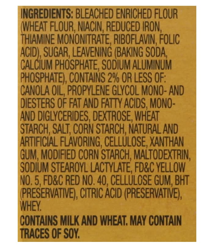 Ingredients: Bleached Enriched Flour Wheat Flour, Niacin, Reduced Iron, Thiamine Mononitrate, Riboflavin, Folic Acid), Sugar, Leavening (Baking Soda, Calcium Phosphate, Sodium Aluminum Phosphate), Contains 2% or Less of: Canola Oil, Propylene Glycol Mono-and Diesters of Fat and Fatty Acids, Mono and Diglycerides, Dextrose, Wheat Starch, Salt, Corn Starch, Natural and Artificial Flavoring, Cellulose, Xanthan Gum. Modified Corn Starch, Maltodextrin, Sodium Stearoyl Lactylate, FD&C Yellow 5, Fd&C Red 40, Cellulose Gum, BHT (Preservative), Citric Acid (Preservative), Whey Contains: Wheat, Milk, Soybeans