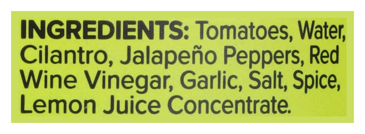 Ingredients: Tomatoes, Water, Cilantro, Jalapeno Peppers, Red Wine Vinegar, Garlic, Salt, Spice, Lemon Juice Concentrate
