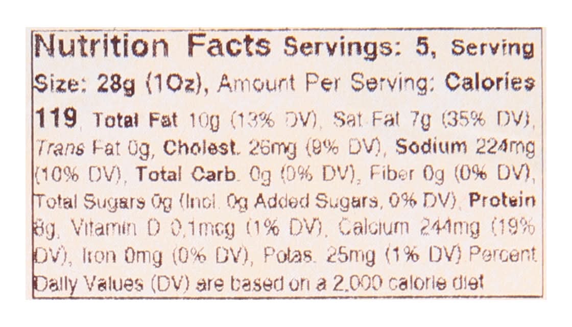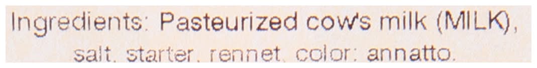 Ingredients: Pasteurized Cow's Milk (Milk), Salt, Starter, Rennet Color: Annatto Contains: Milk