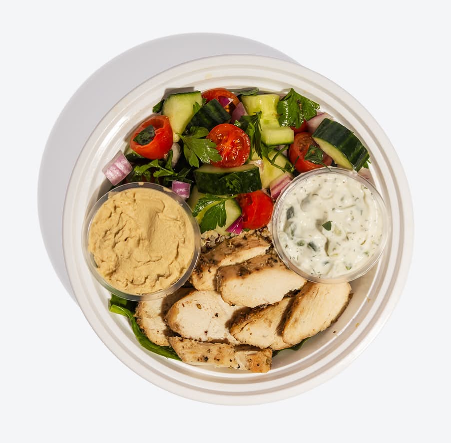 Baby Spinach, Dill Quinoa Rice, Roasted Chicken, Hummus, Tzatziki. Contains Milk and Sesame.