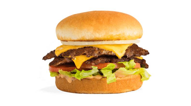 Two steakburger patties, cheese, full slice of onion, Thousand Island, lettuce & tomato served on a toasted bun.