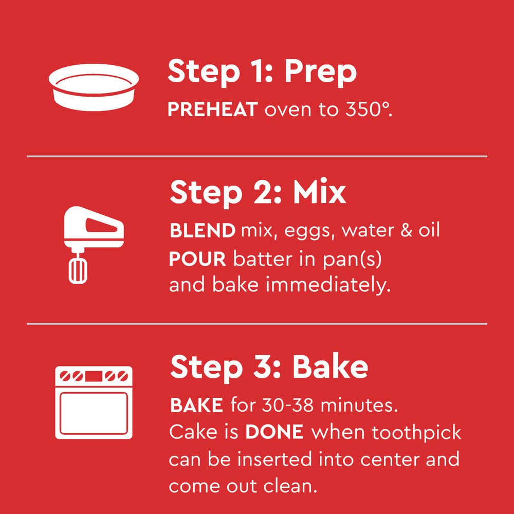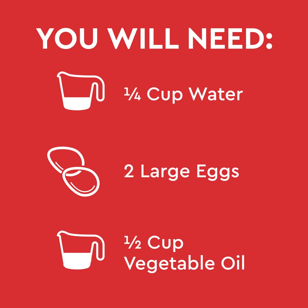 You will need: 3 large eggs; water; vegetable oil. fudgy brownies: 2 eggs; 1/4 cup water; 1/2 cup oil. cake-like brownies: 3 eggs; 1/4 cup water; 1/2 cup oil. baking instructions: see side of box for ingredient swaps. step (1) prep: preheat oven to 350 degrees f. for metal and glass pan, 325 degrees f for dark or coated pan (add 3-5 minutes for dark or coated pan. brownie is done when toothpick inserted 1 inch from the edge of pan comes out clean). grease bottom of pan. step (2) mix: empty brownie mix, eggs, water and oil in a large bowl. stir until well blended (about 50 strokes). spread into greased pan and bake immediately. step (3) bake: bake in center of over at 350 degrees f. following chart below. cool completely in pan on wire rack before cutting and serving. high altitude (over 3,500 ft): preheat oven to 350 degrees f. stir 2 tbsp flour into brownie mix. mix according to the directions in step (2). bake at 350 degrees f. 13 x 9 inch pan 21-23 min. pan size: 8 x 8 inch: 31-34 min (bake time); pan size: 9 x 9 inch: 27-30 min. (bake time); pan size: 13 x 9 inch: 21-23 min. (bake time). yummy no matter how you bake it! tip: sprinkle with candy before baking! for extra fudgy & moist brownies, bake in an 8 x 8 pan. try these ingredient swaps! replace 1/4 cup water with: 1/4 cup dairy or plant-based milk. replace 1/2 cup vegetable oil with: 1/2 cup refined coconut oil.