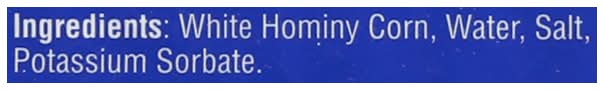 Ingredients: White Hominy Corn, Water, Salt, Potassium Sorbate